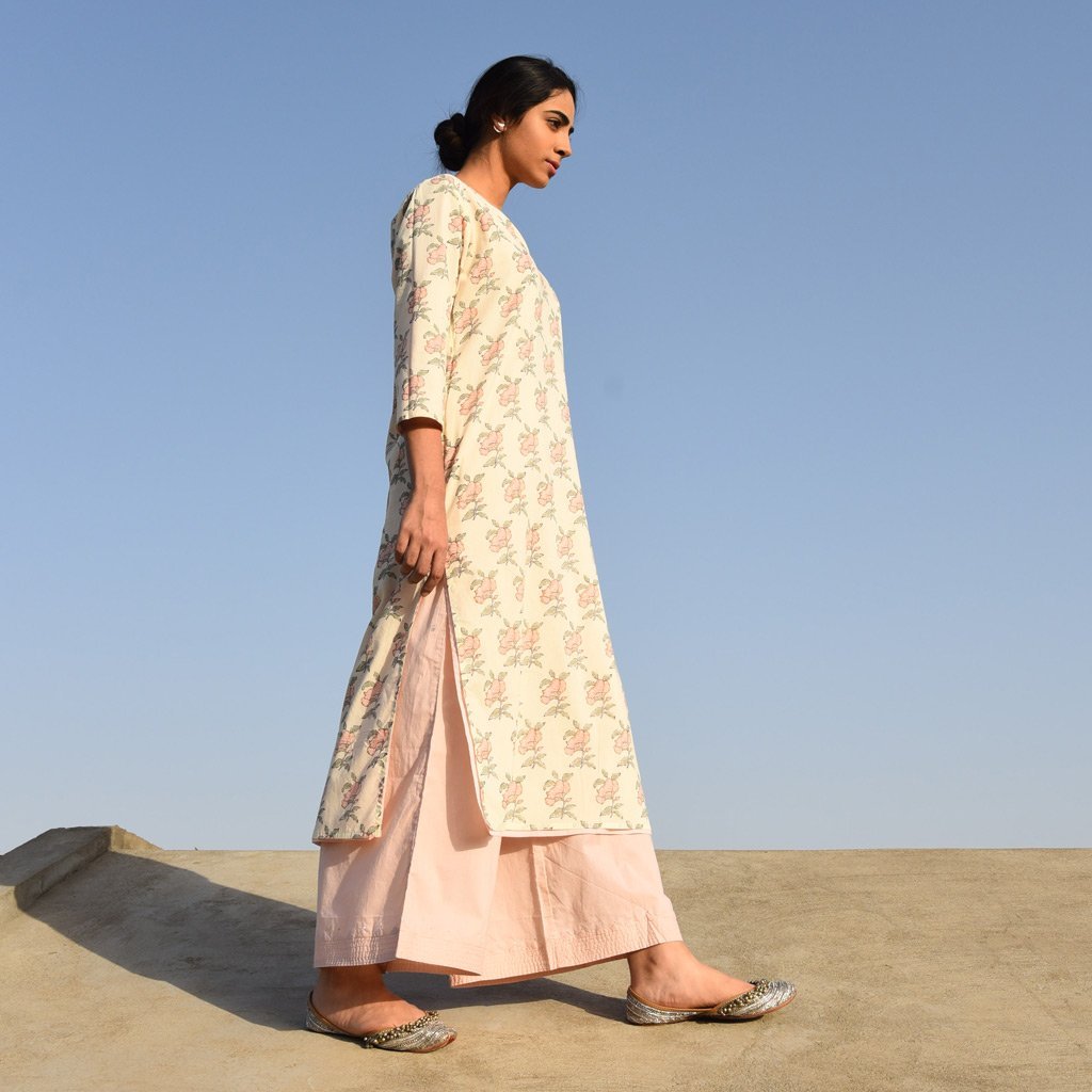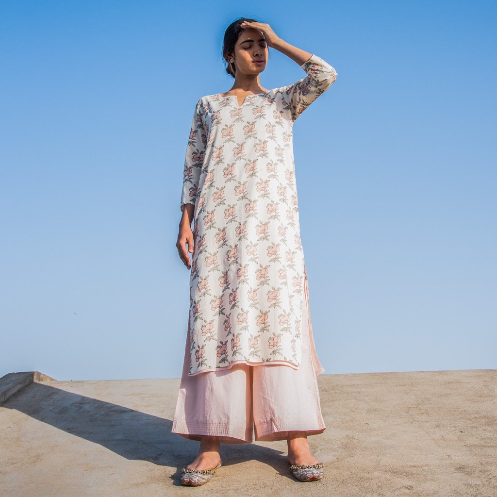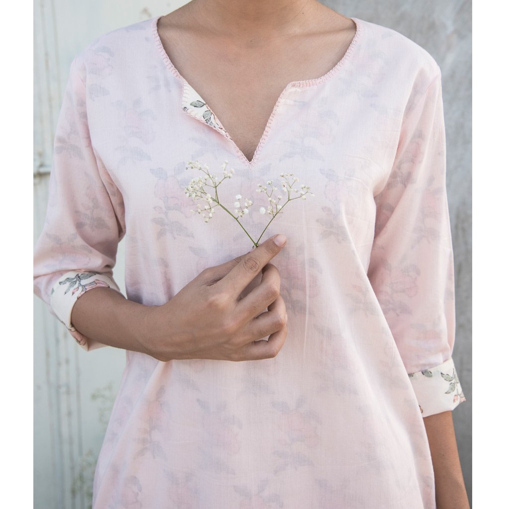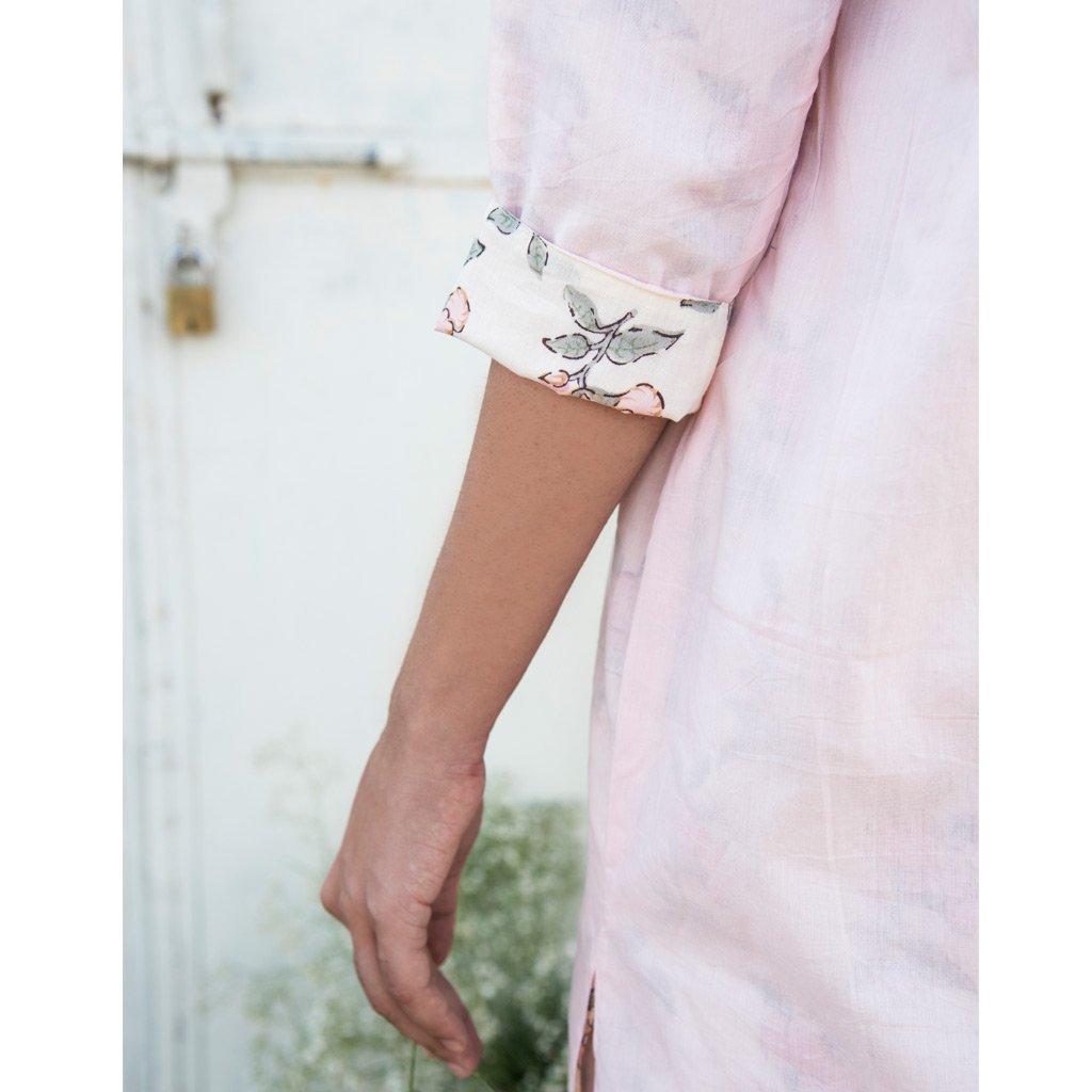 Reversible cotton mul mul kurta, powder pink on one side and hand block printed roses floral all over in shades of pink on the other. Kurta can be worn on both sides. Stitch detailing on neck in monotone.