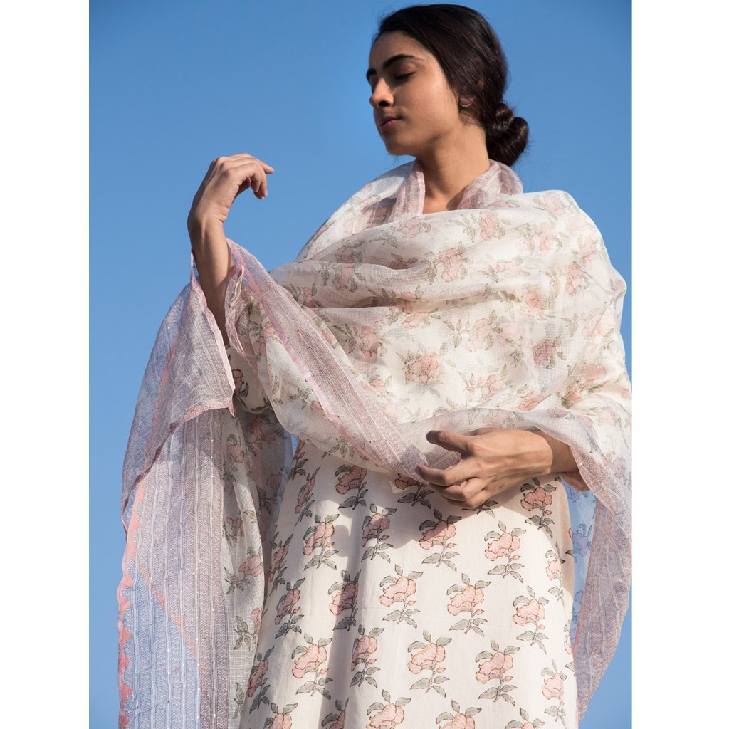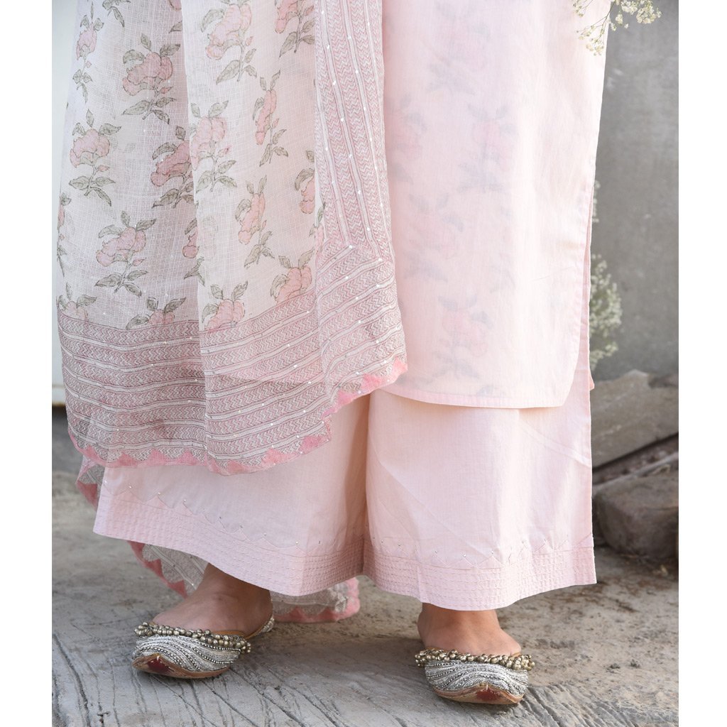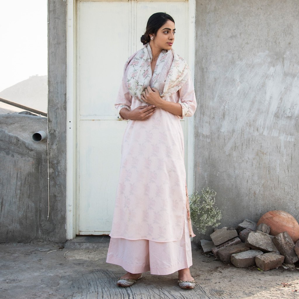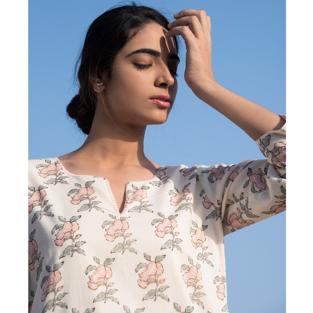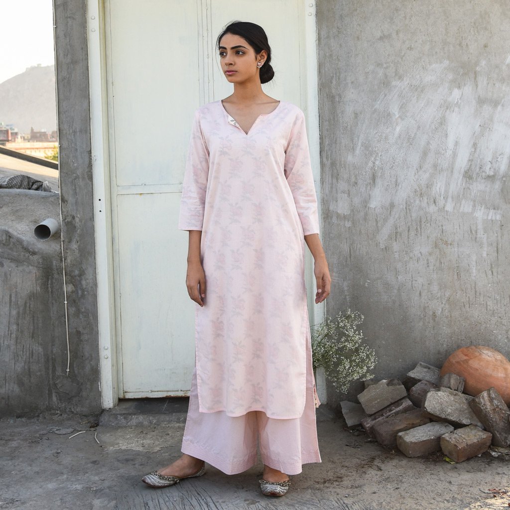 Reversible cotton mul mul kurta, powder pink on one side and hand block printed roses floral all over in shades of pink on the other. Kurta can be worn on both sides. Stitch detailing on neck in monotone.