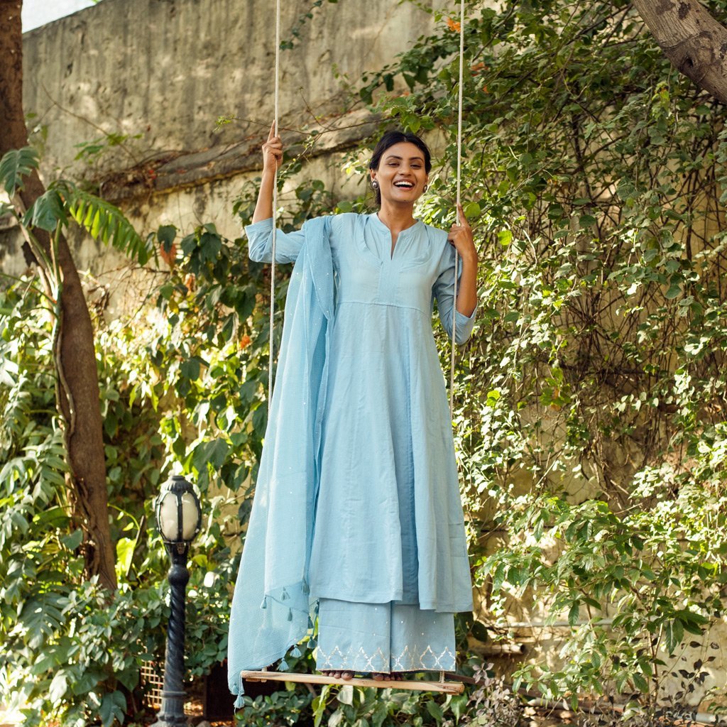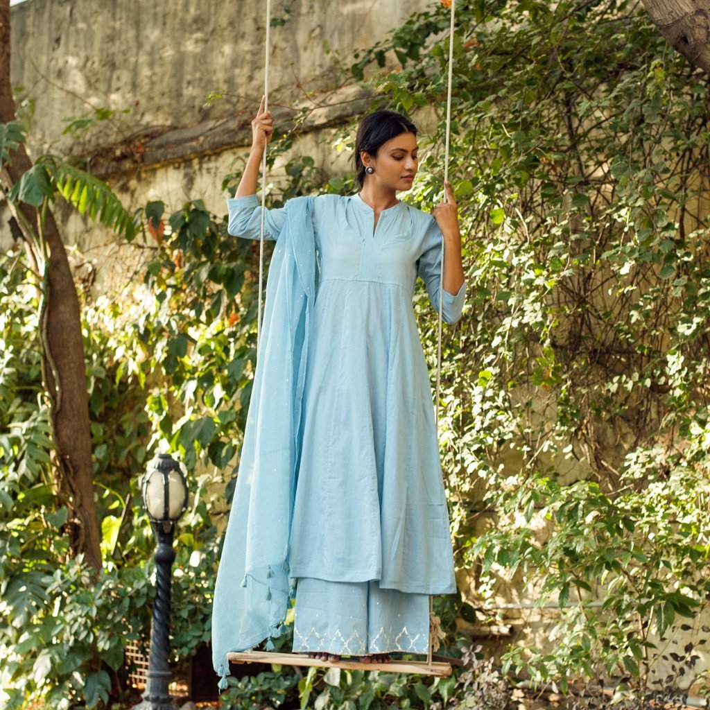 Sky blue coloured ijaar in cotton mul-mul fabric, embellished with silver gota hand emboidered in a Rajasthani inspired jaali design and silver sitara hand embroidered over the jaali.