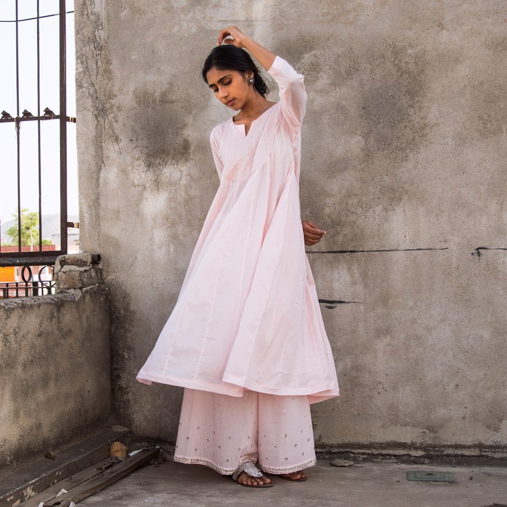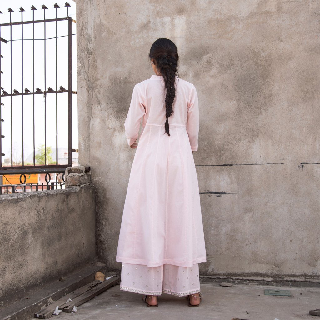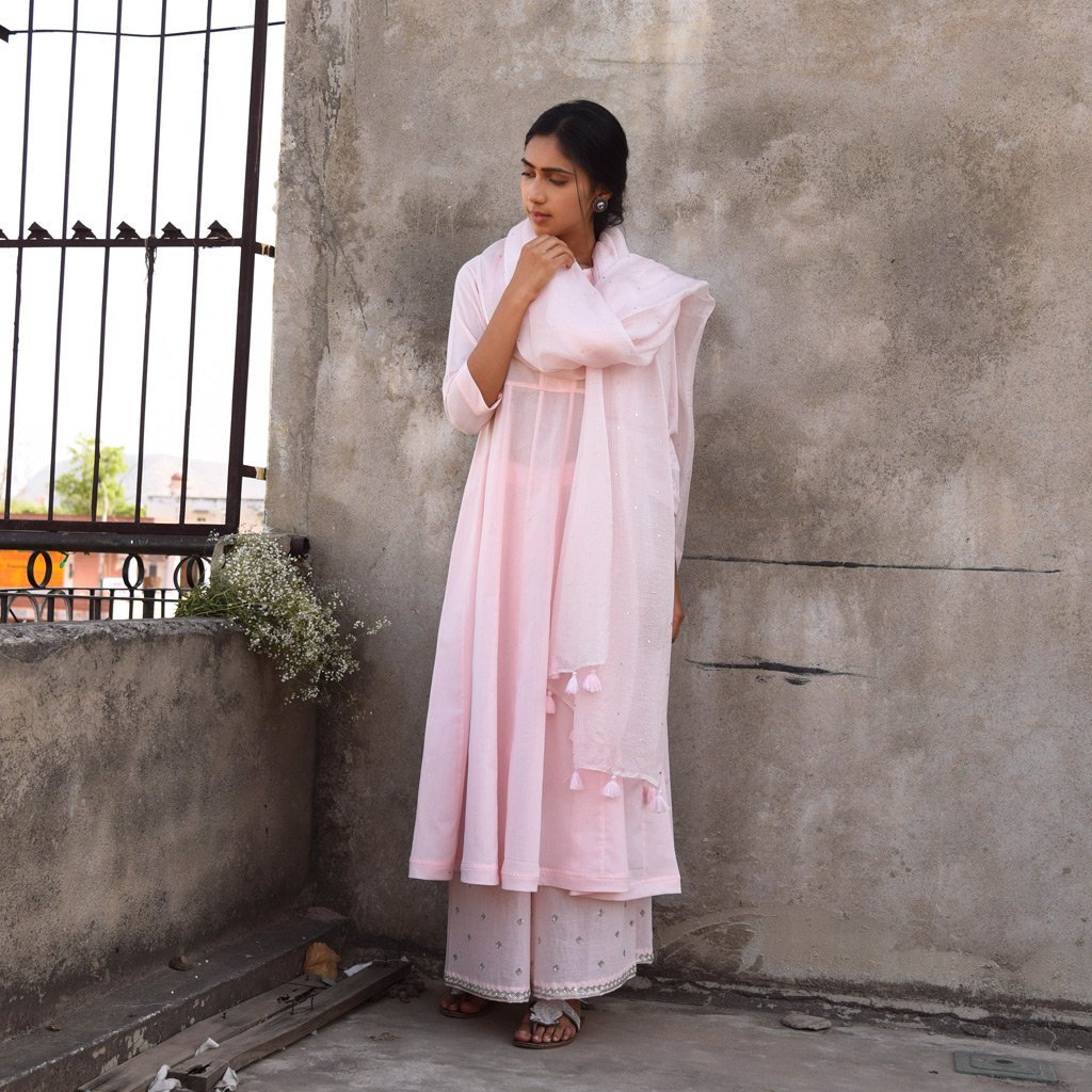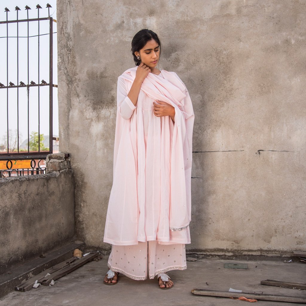 Cotton mulmul wide legged ijaar bottom in a soft baby pink colour embellished with cut-dana and tara in a traditional border bootie pattern in silver .