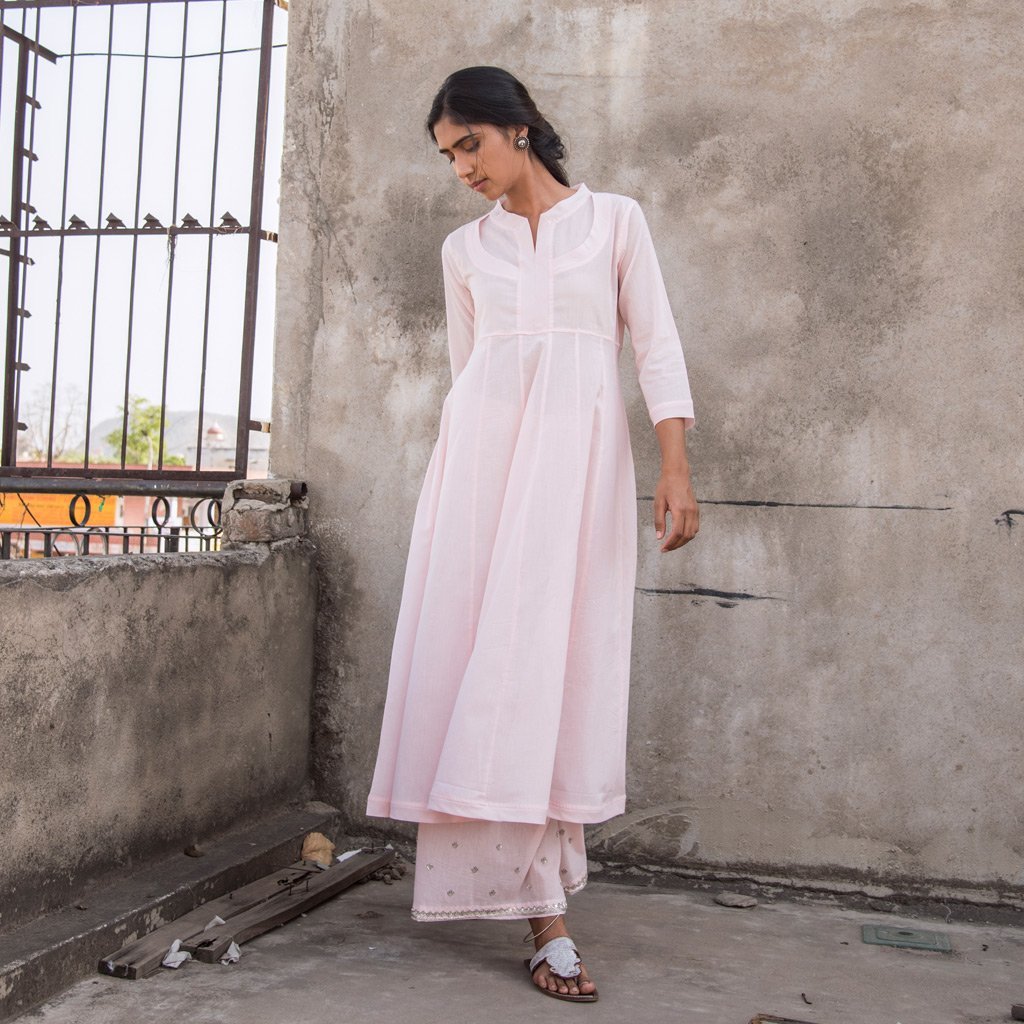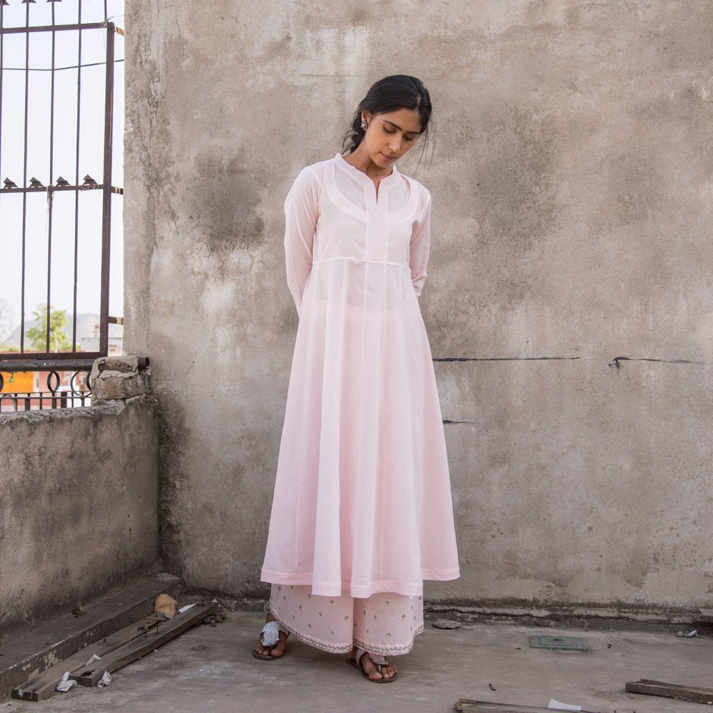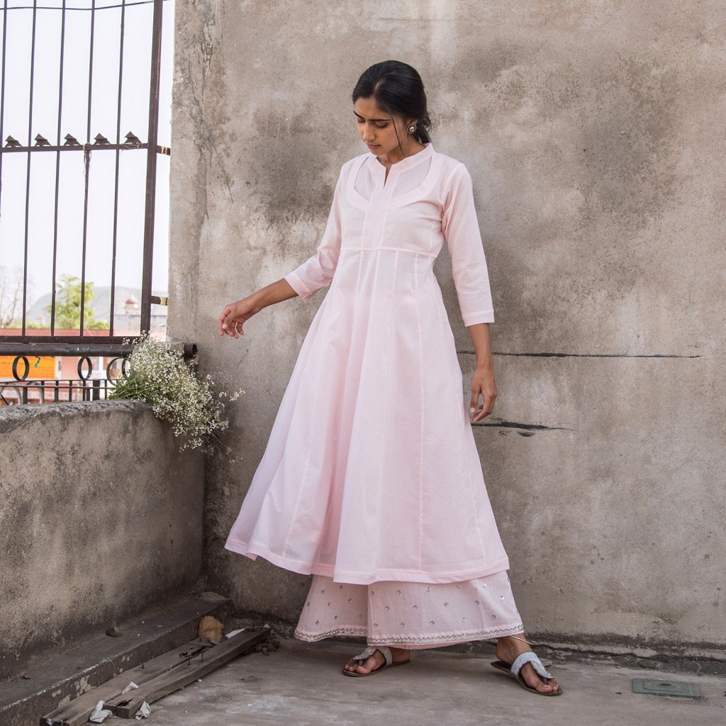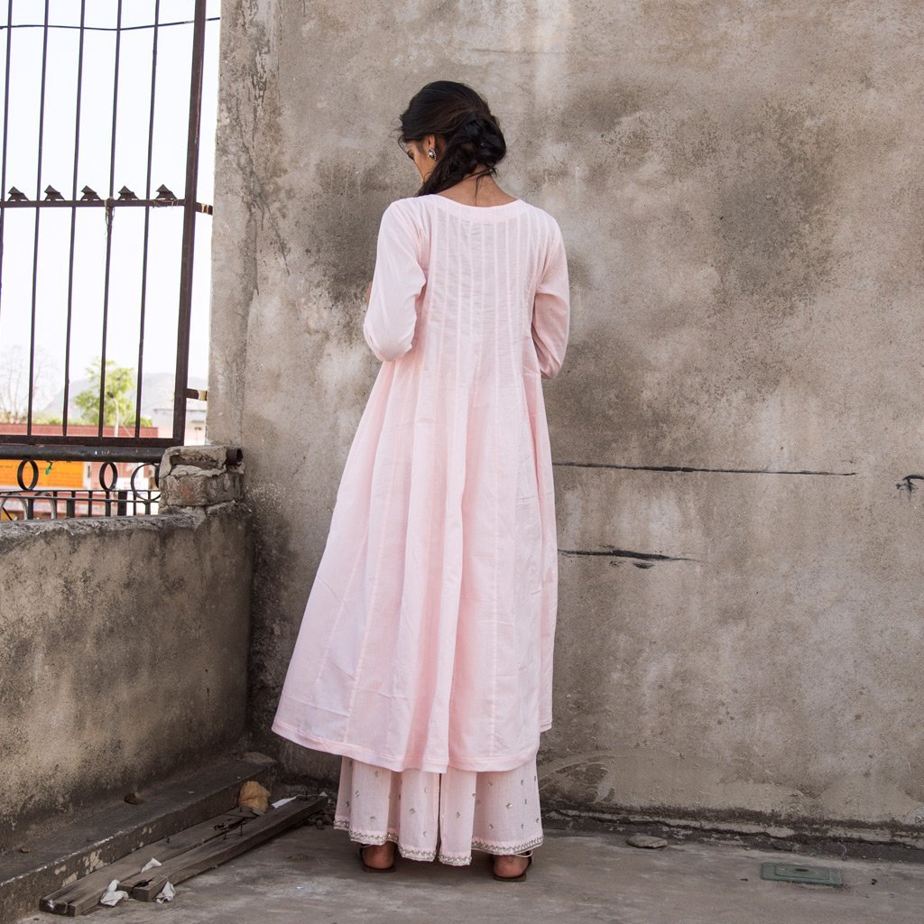 Cotton mulmul wide legged ijaar bottom in a soft baby pink colour embellished with cut-dana and tara in a traditional border bootie pattern in silver .