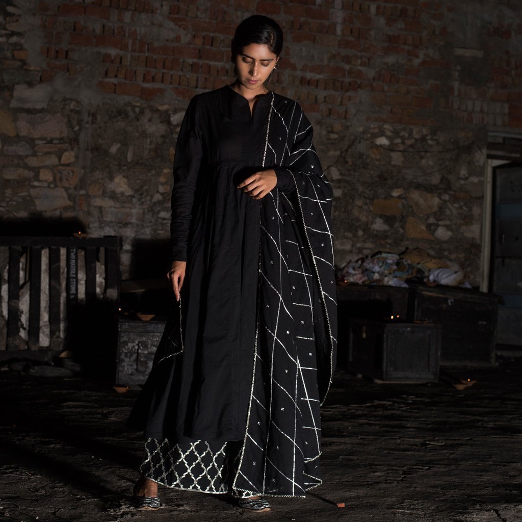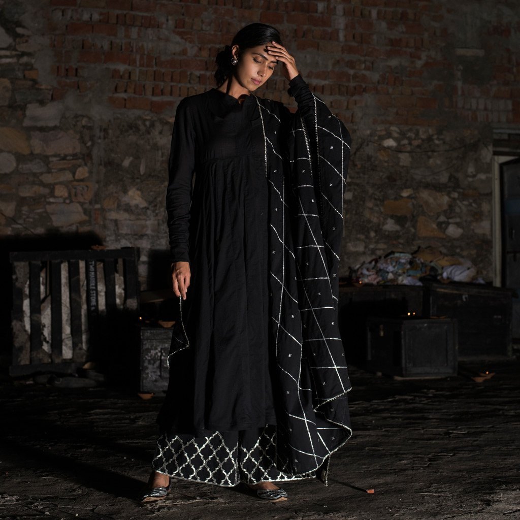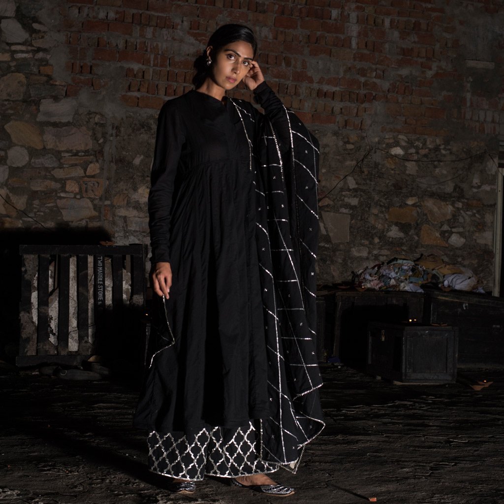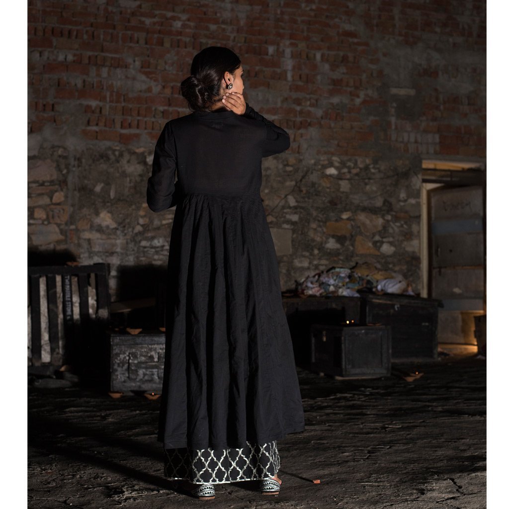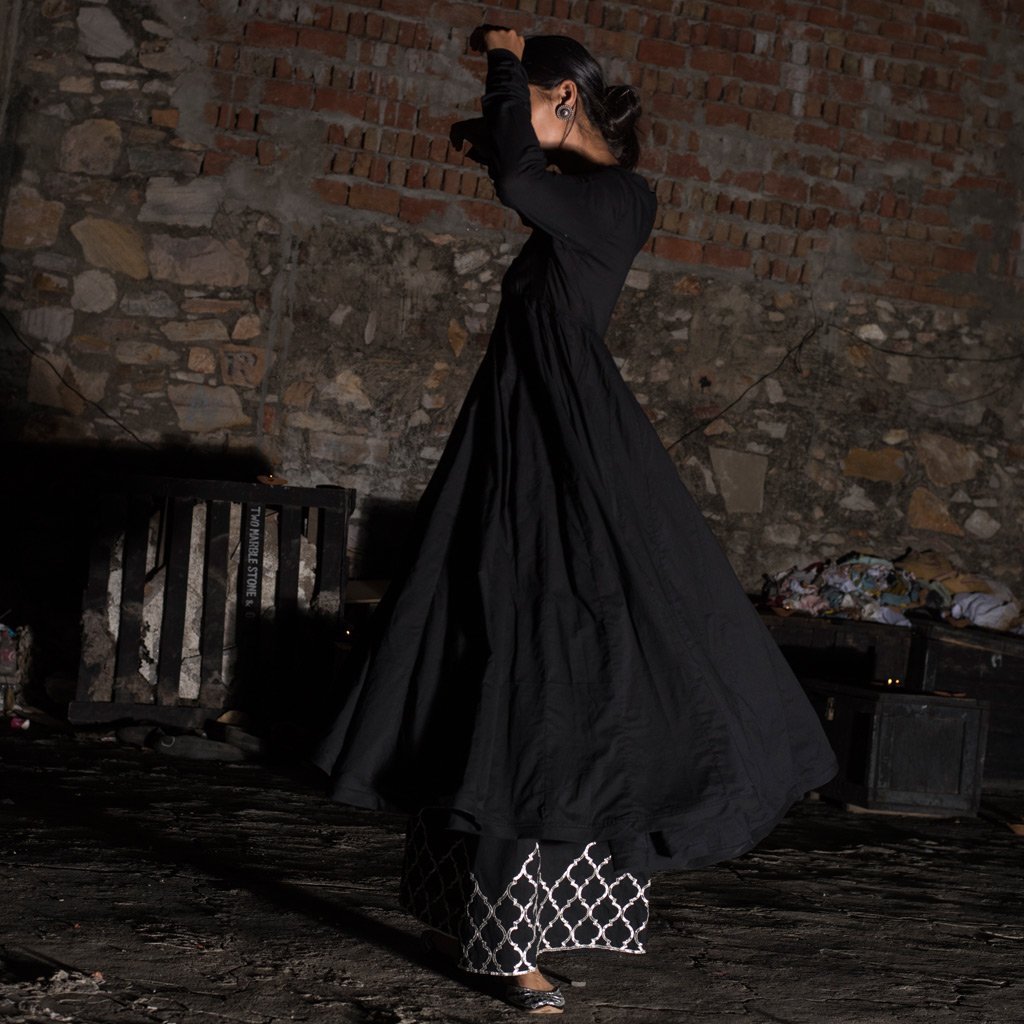 Our signature best selling outfit in a midnight black cotton mulmul. The Rajasthani kalidaar kurta is an inspiration from the kurti-kaanchali worn by Rajasthani women in their traditional outfits. This a gere-wala kalidaar and comes with eight meters of ghera and churi sleeves to lend to it a more dramatic feel.