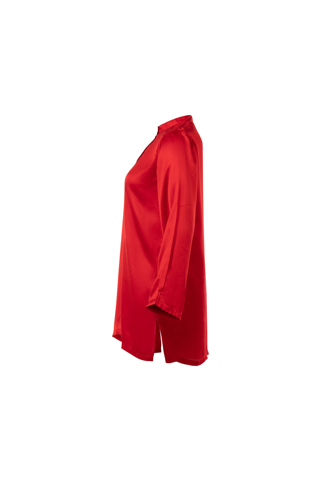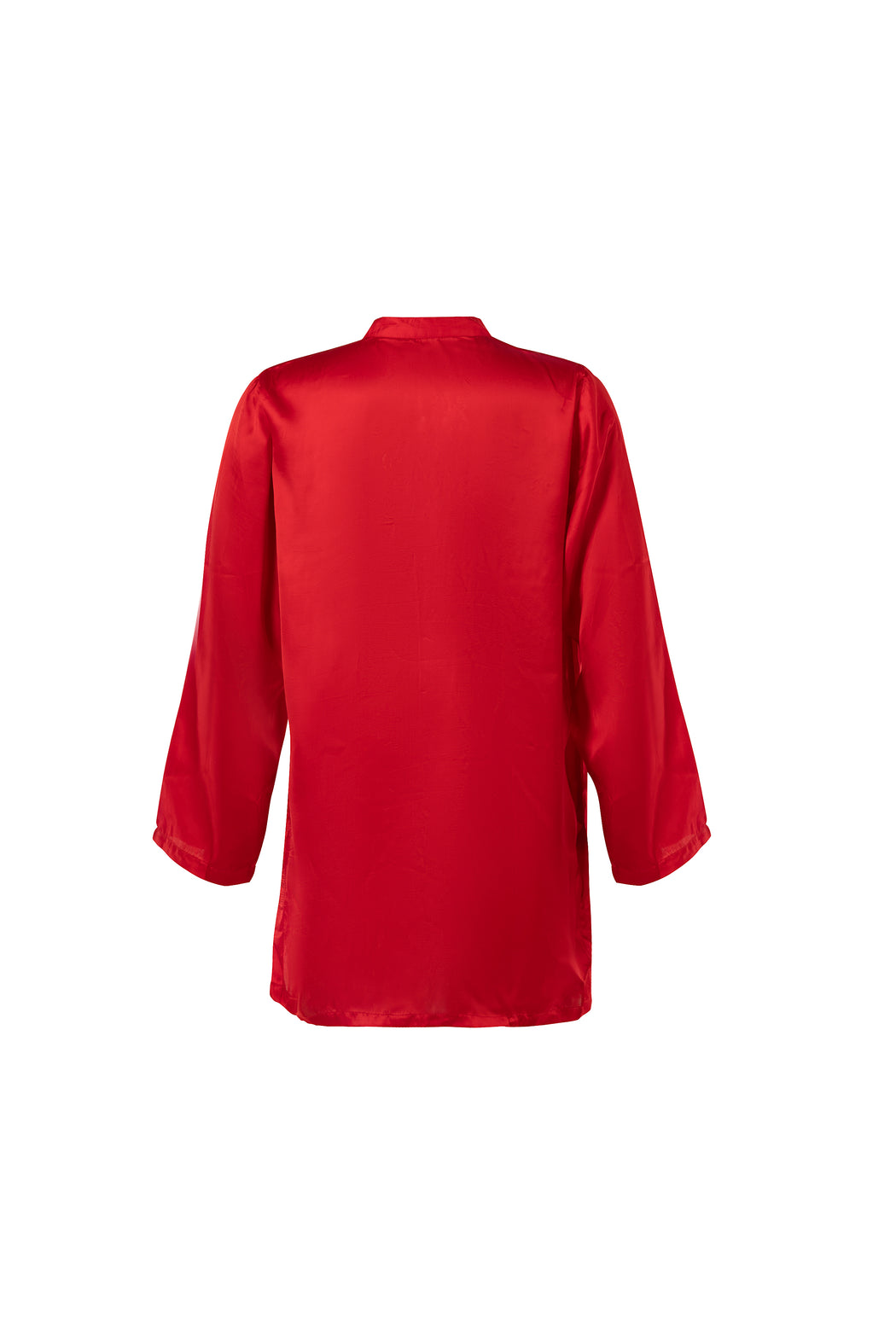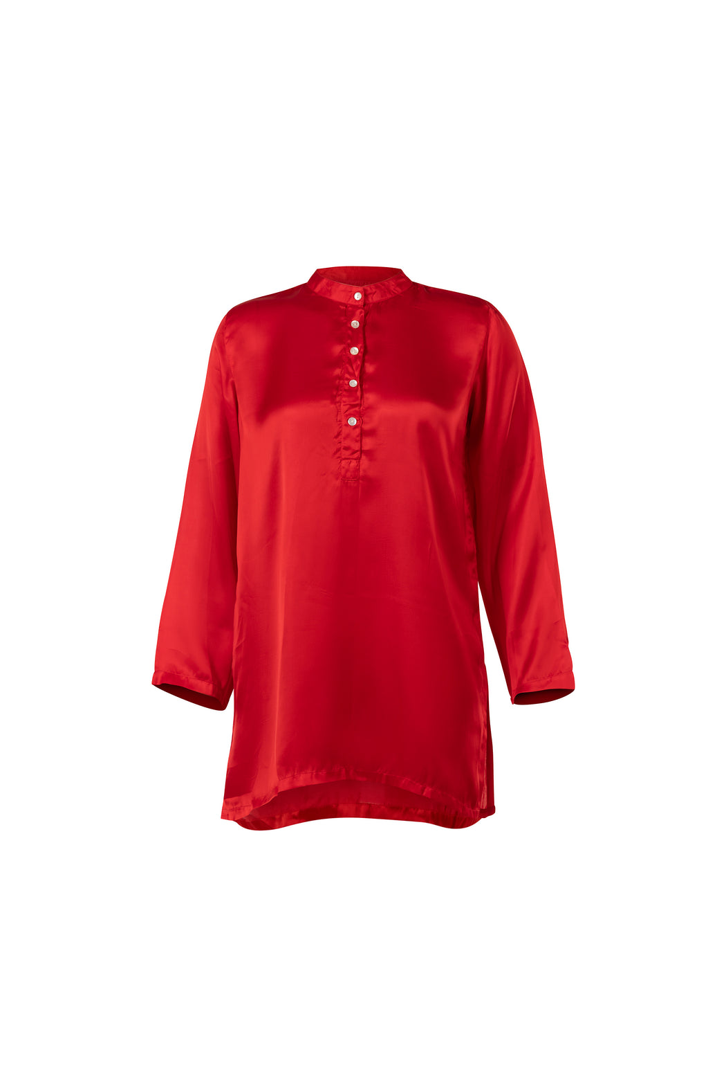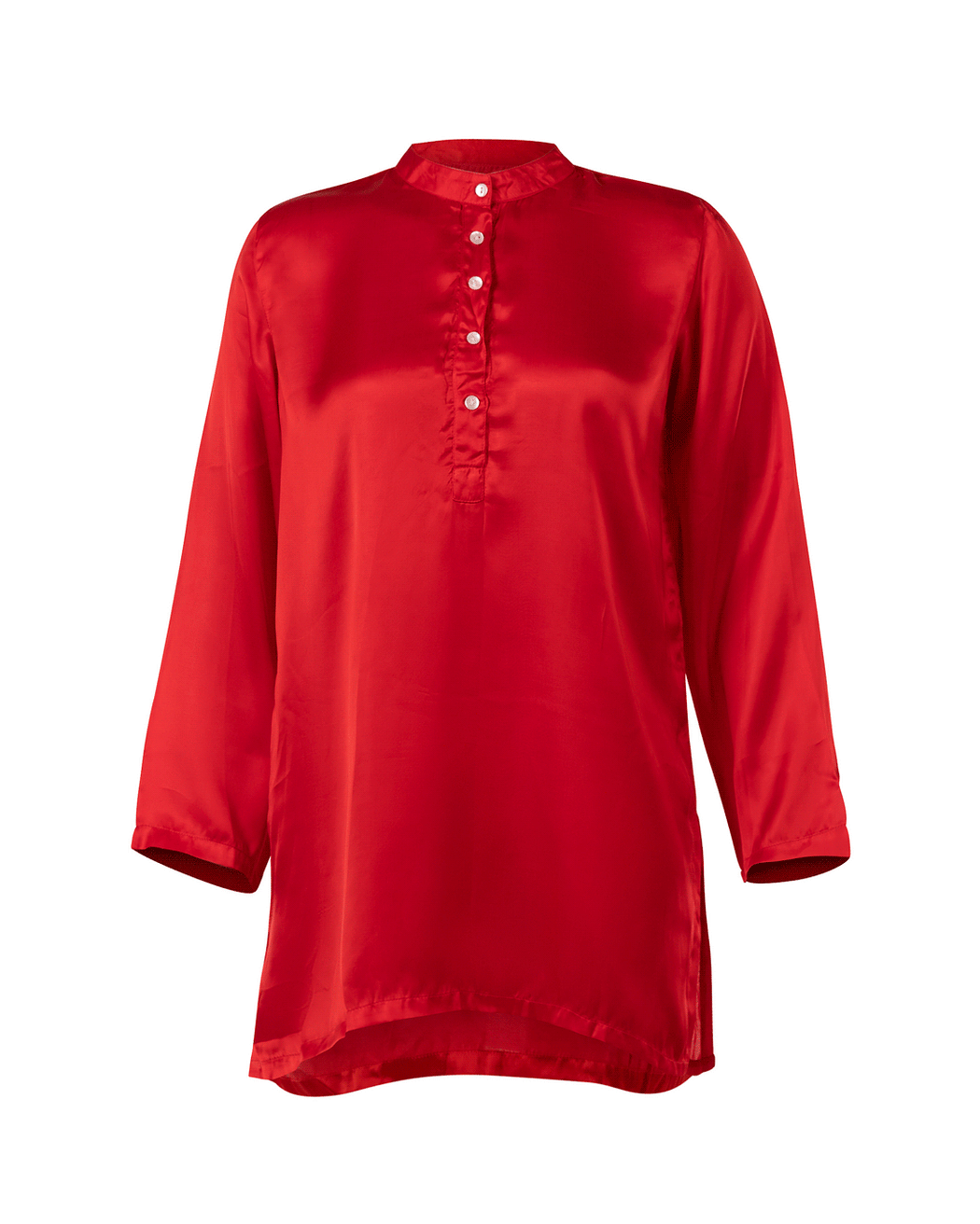Our take on the traditional collared short kurta. We've made it in our favorite brights in a pure satin fabric with mother-of-pearl buttons on the loosely fitted shirt.