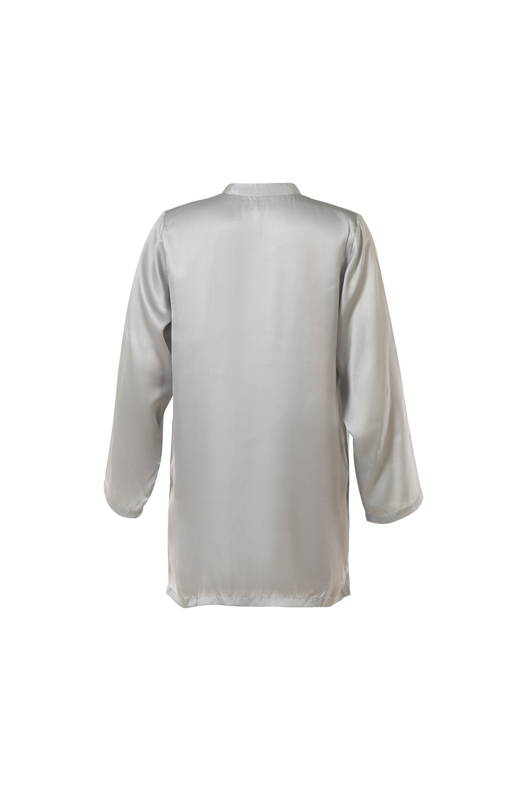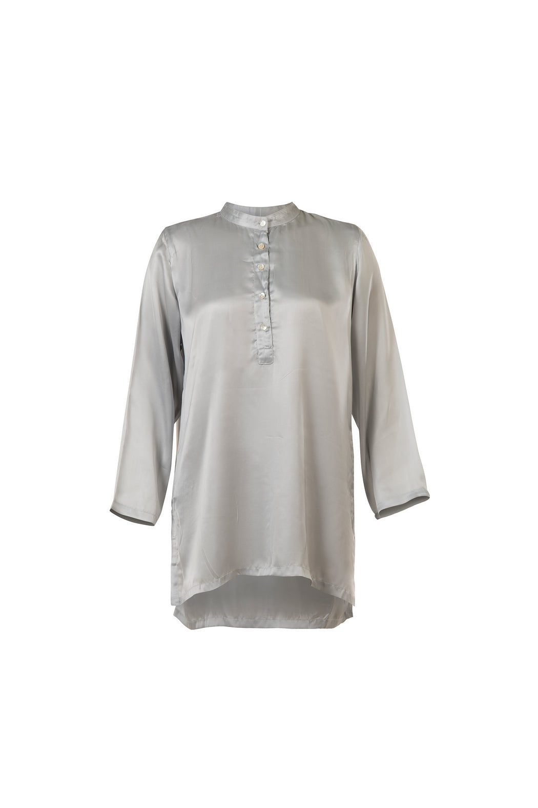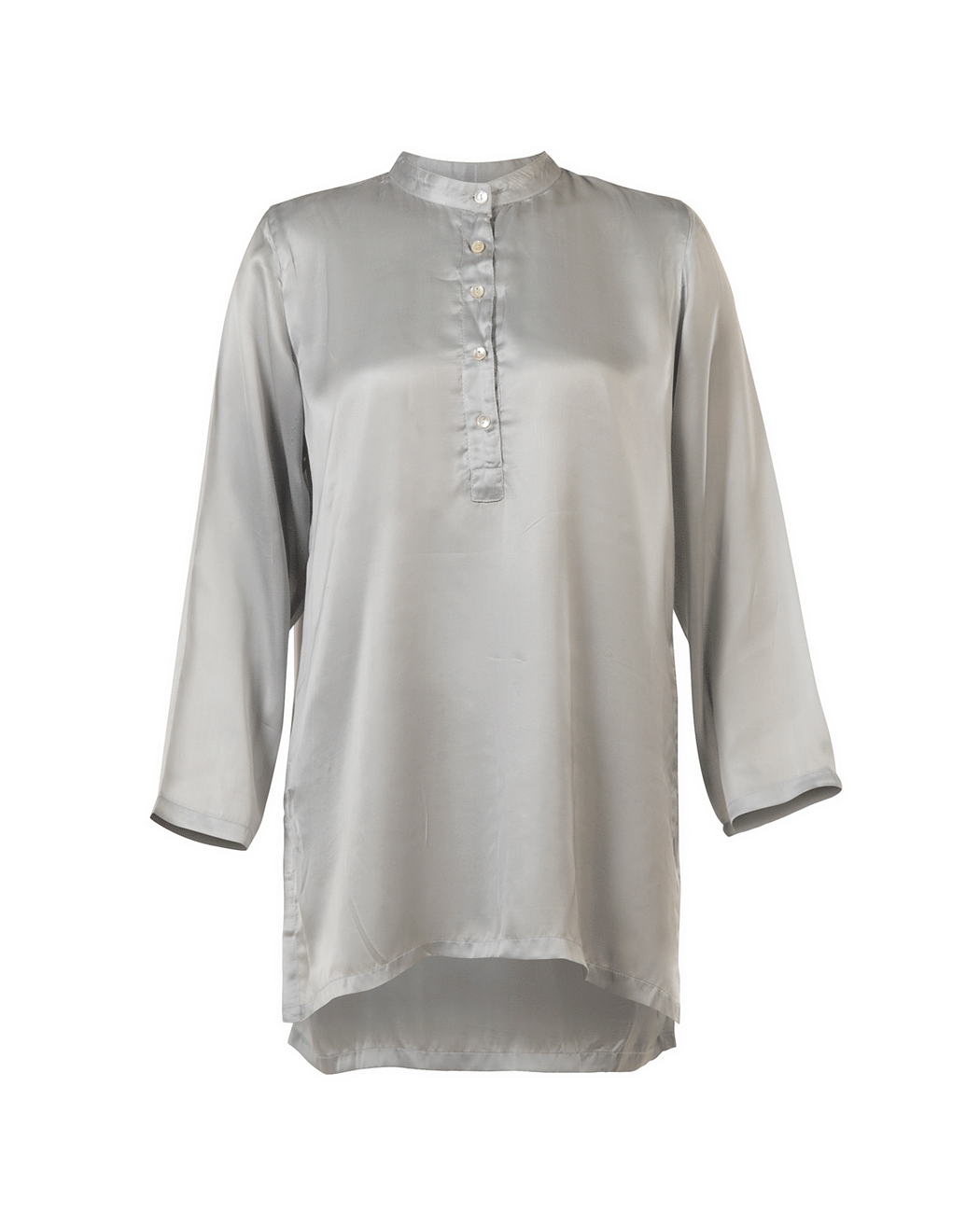 Our take on the traditional collared short kurta. We've made it in our favorite brights in a pure satin fabric with mother-of-pearl buttons on the loosely fitted shirt.