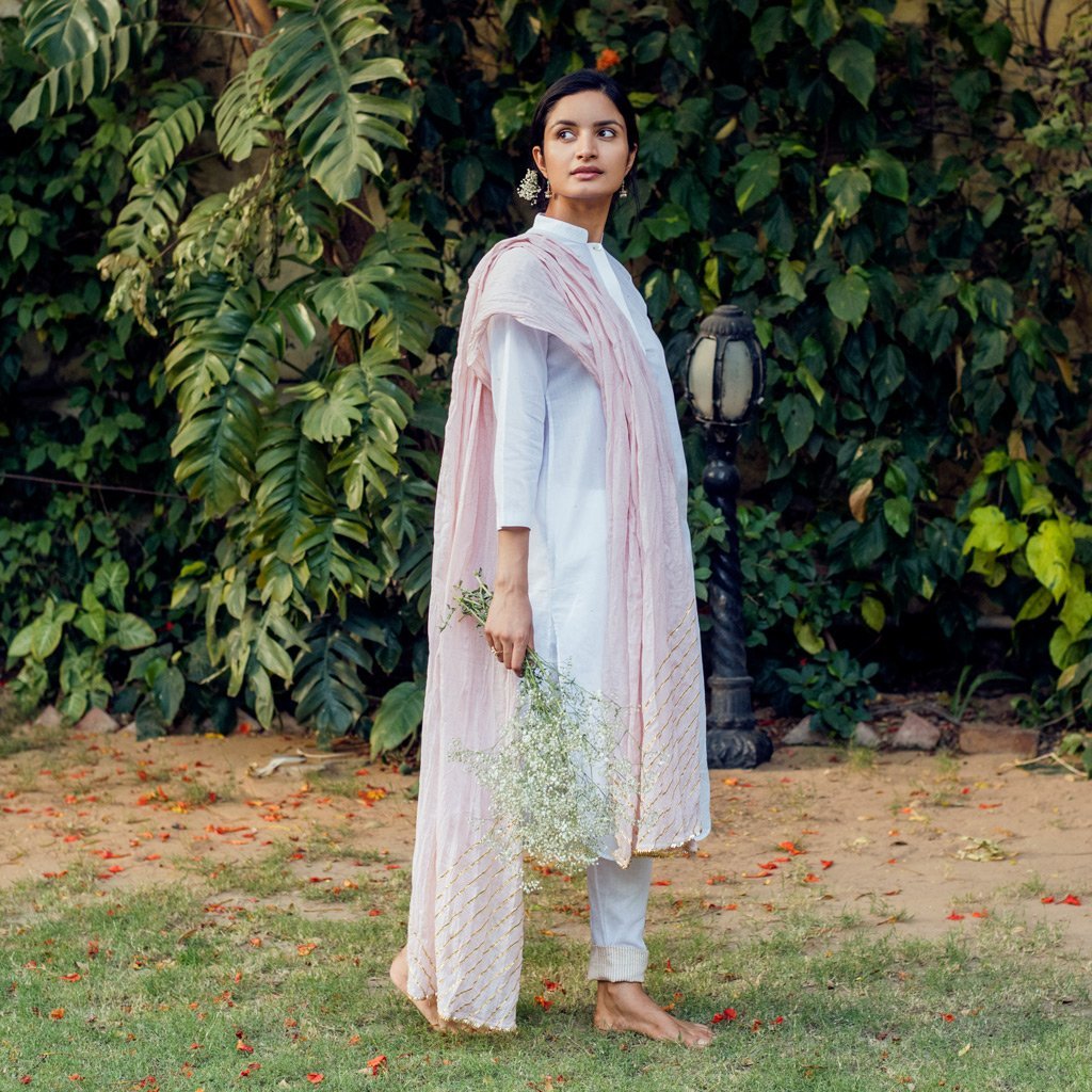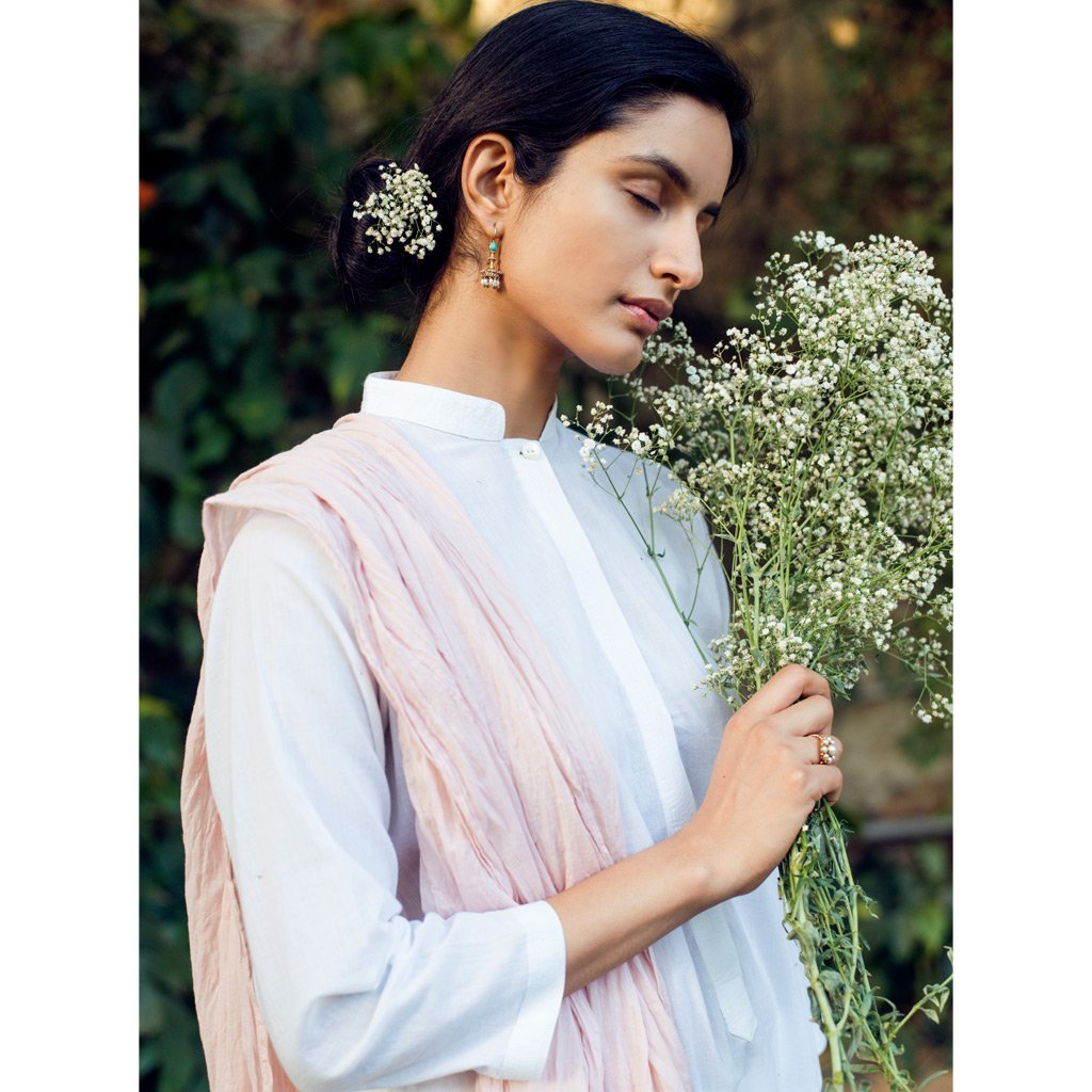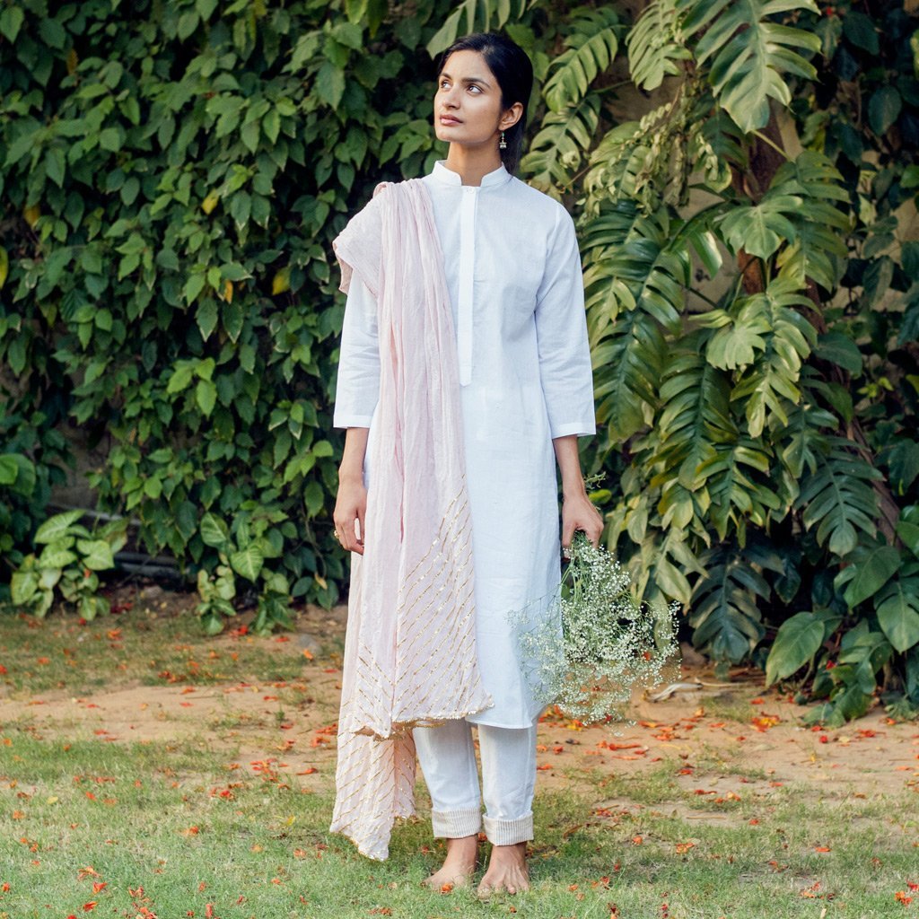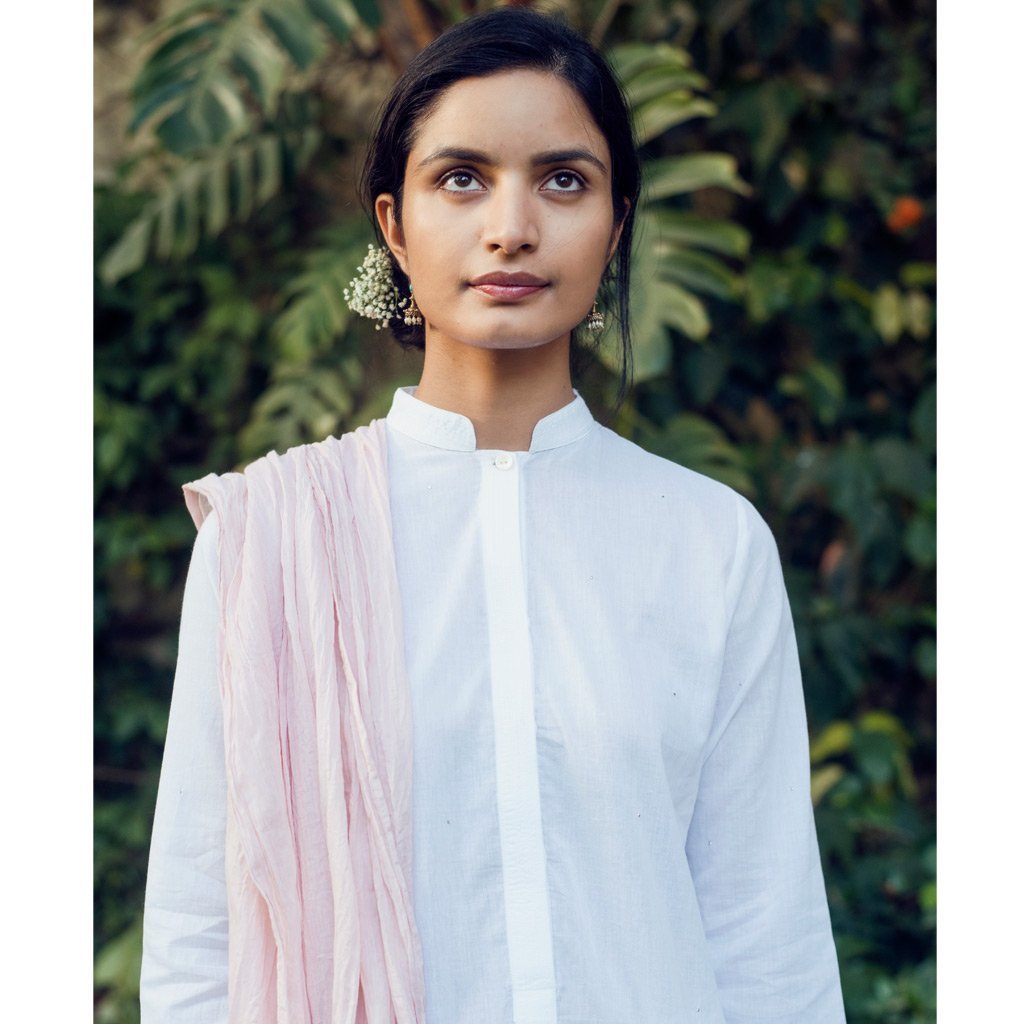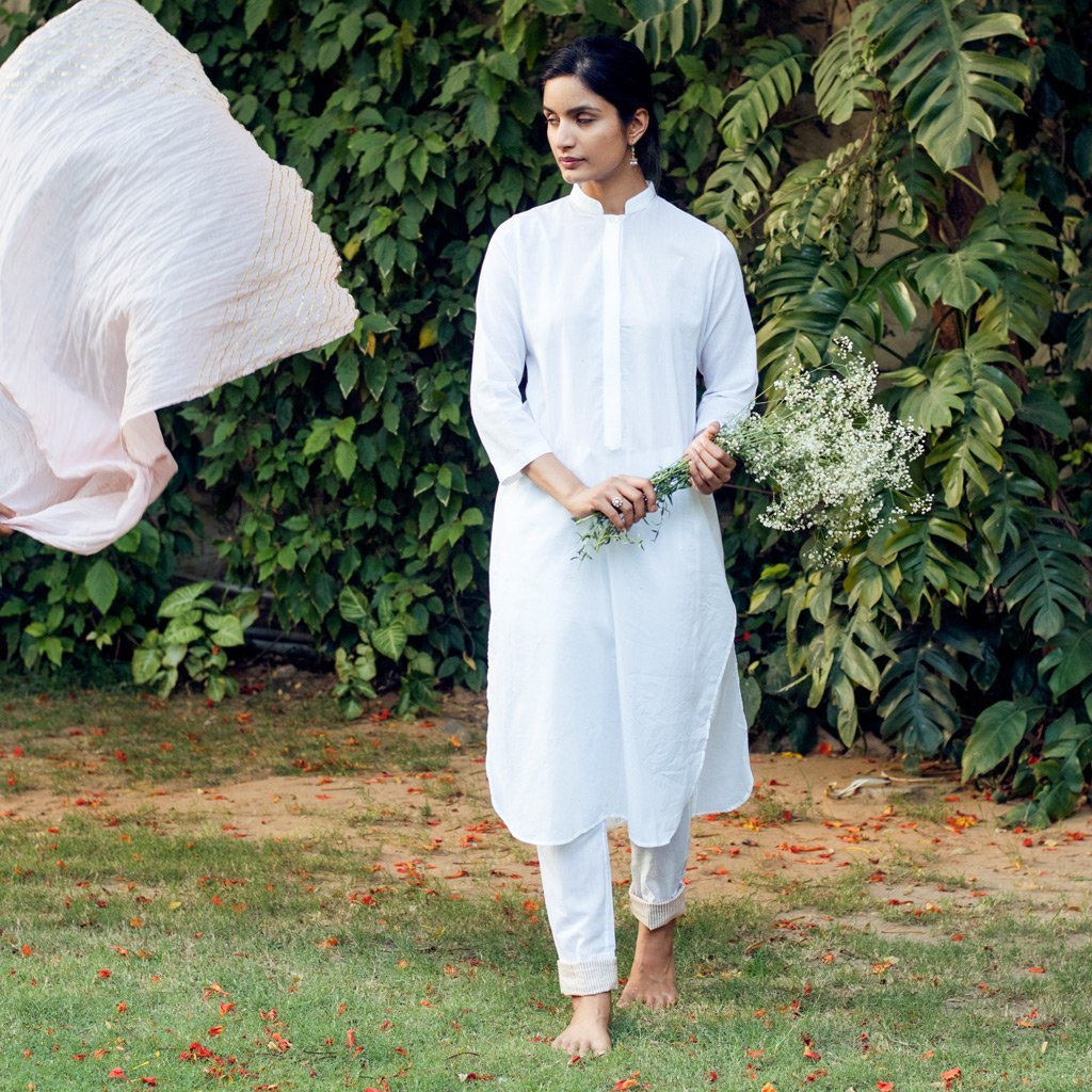 Our take on the comfort kurtas of the Khadi Bhandaars of India.This long kurta is made in cotton mulmul in a pristine white colour, with stich detailing on sleeves and cuffs and a rounded hem, embeliished with little dots of understated silver mukaish.