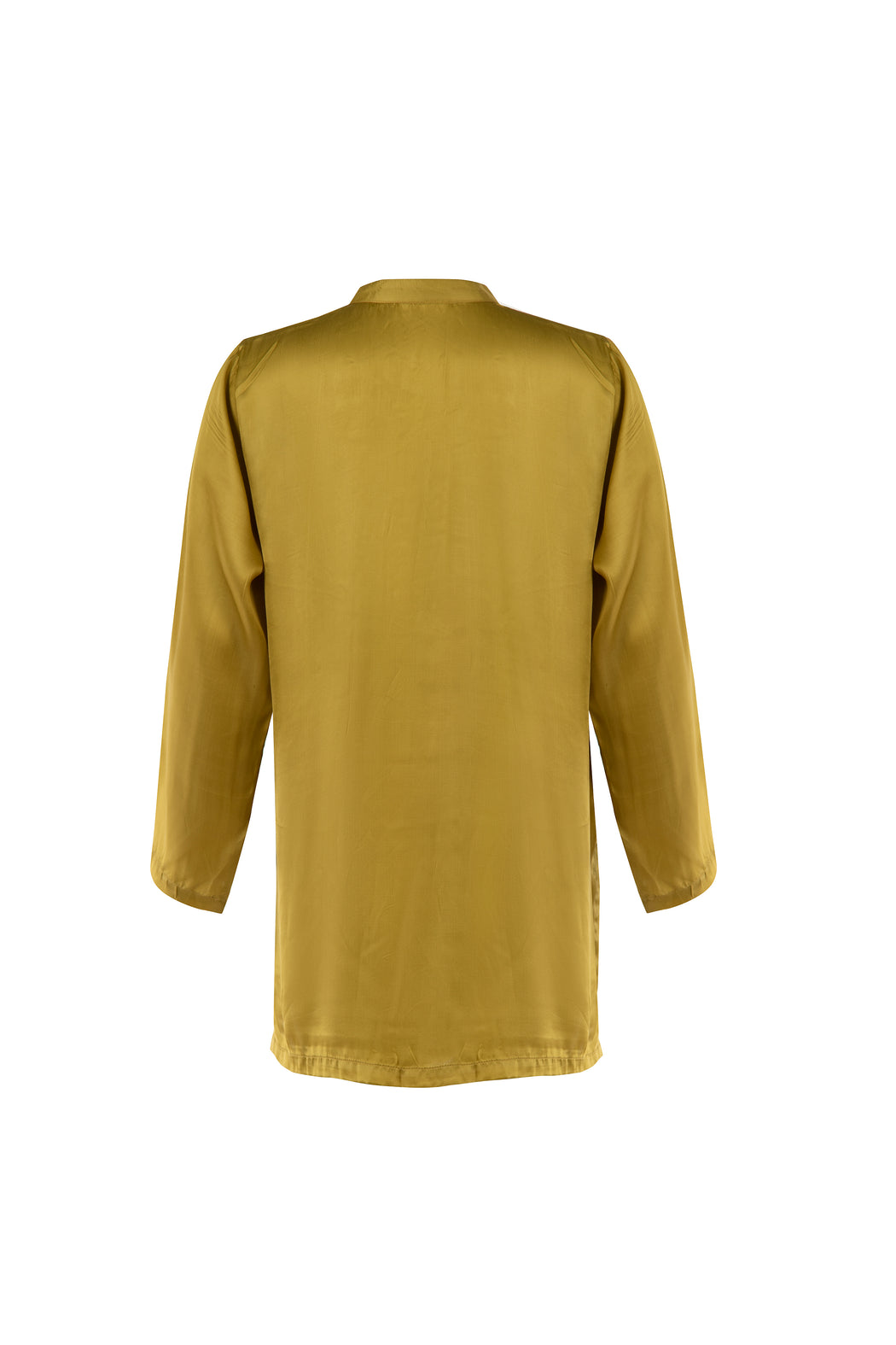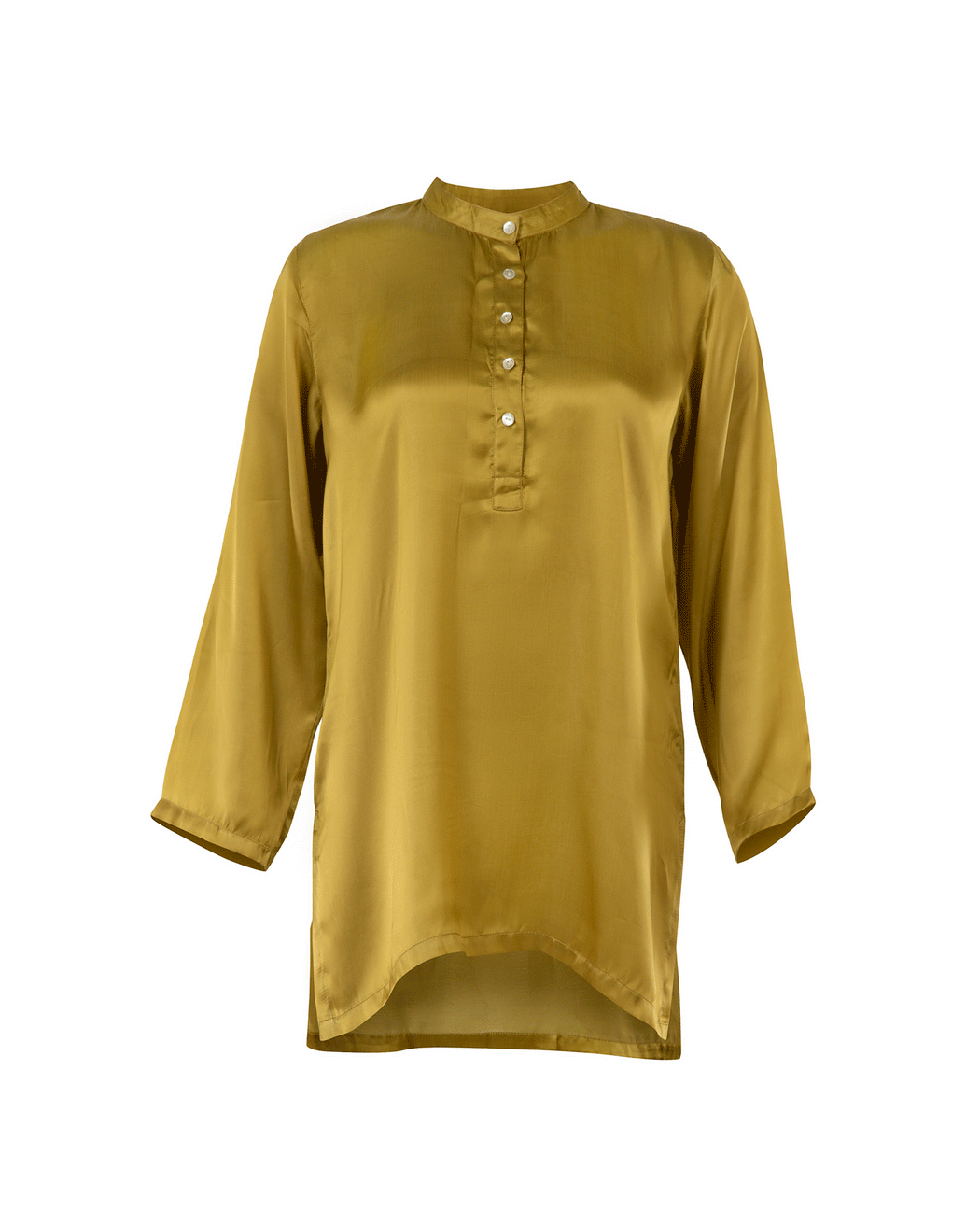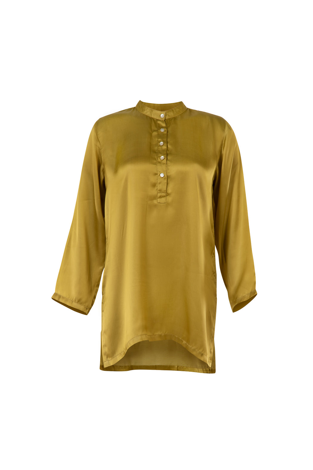Our take on the traditional collared short kurta. We've made it in our favorite brights in a pure satin fabric with mother-of-pearl buttons on the loosely fitted shirt.