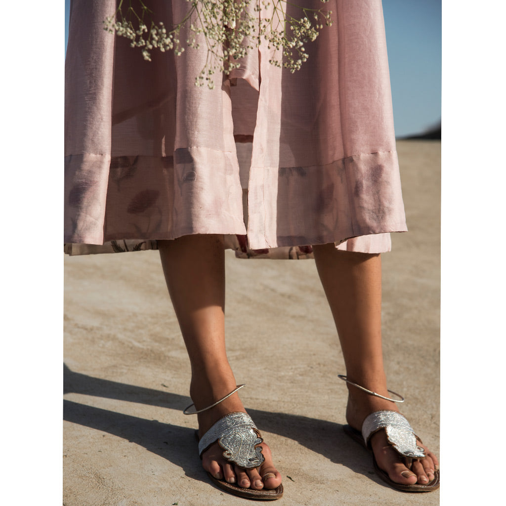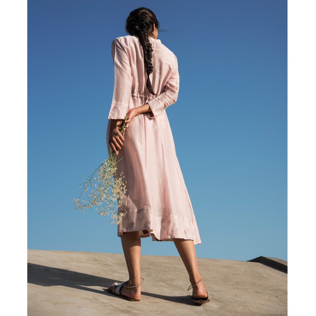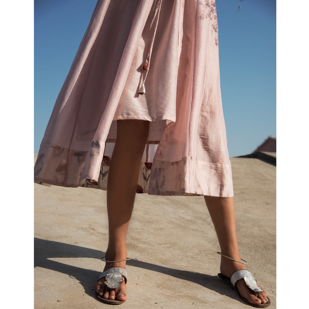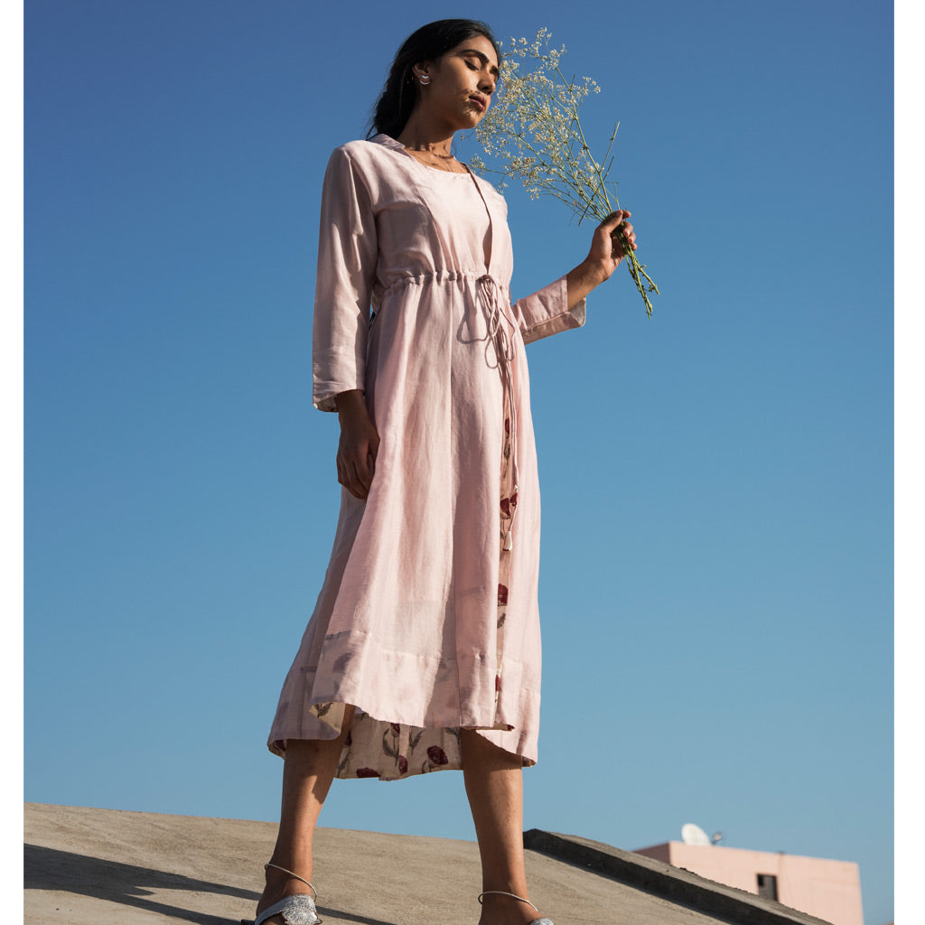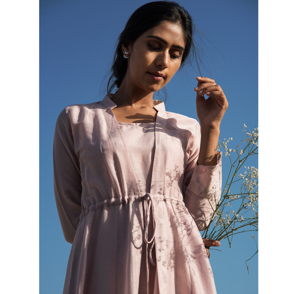 Angrakha inspired two-piece kurta dress in handspun chanderi kurta dress in an old rose colour with a front tie on the waist. Outfit is a 2 piece set with mughal poppy hand block printed chanderi facings on jacket hem and cuffs.