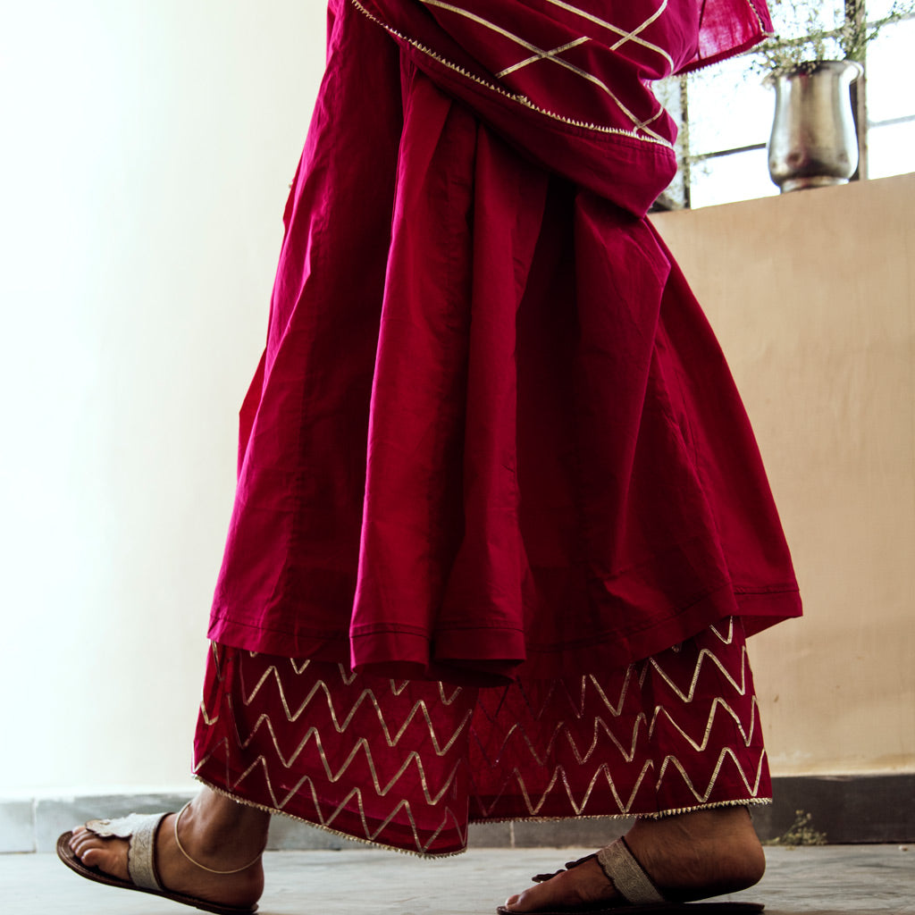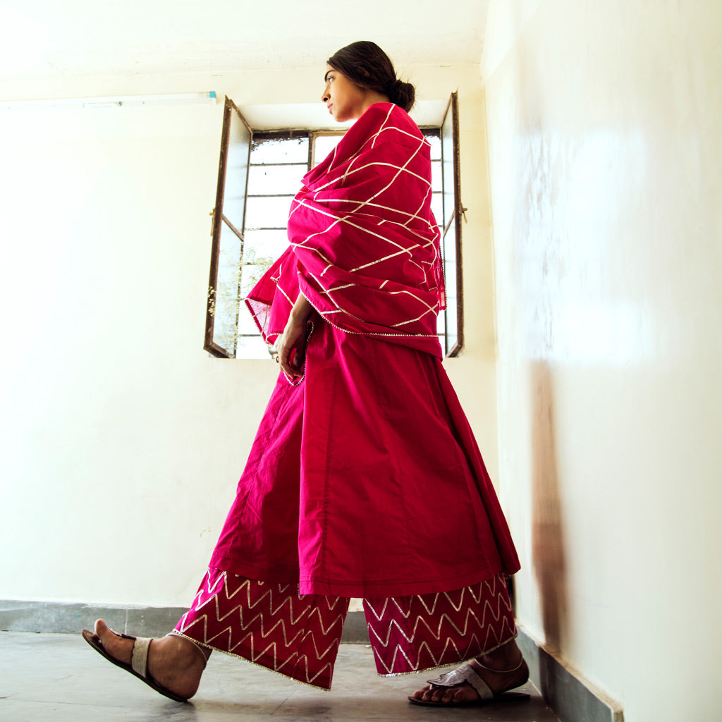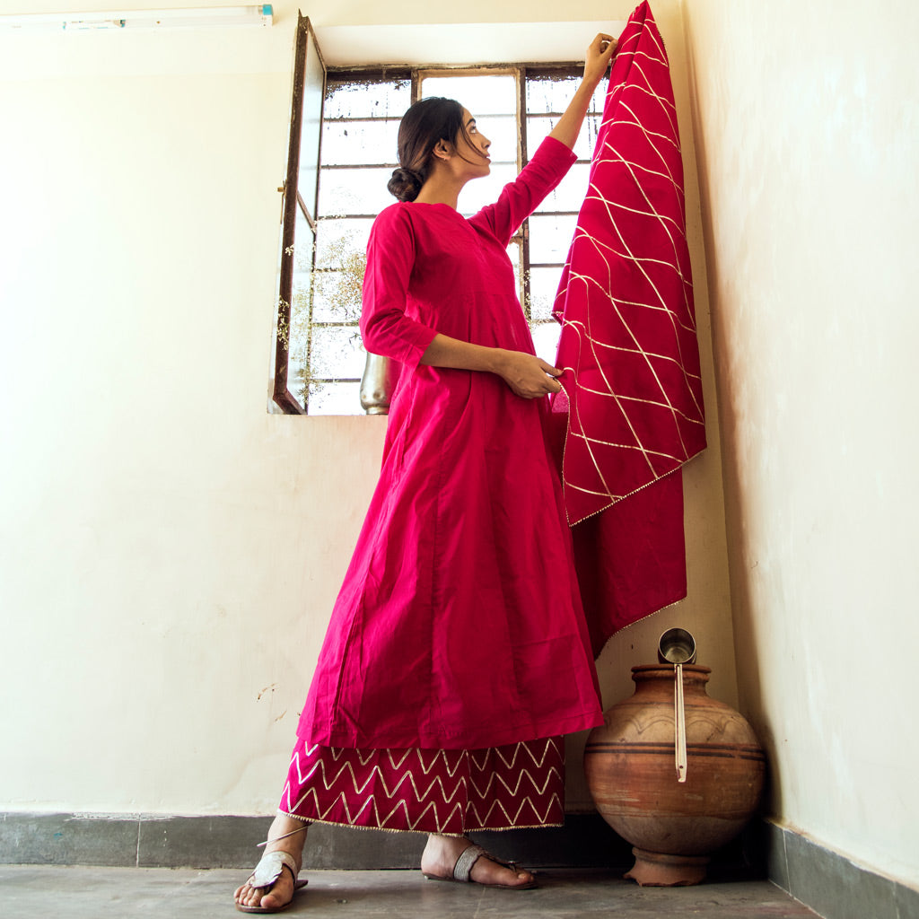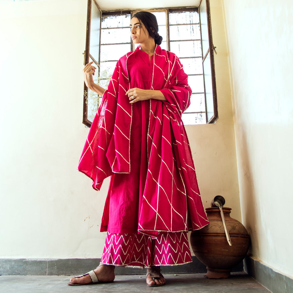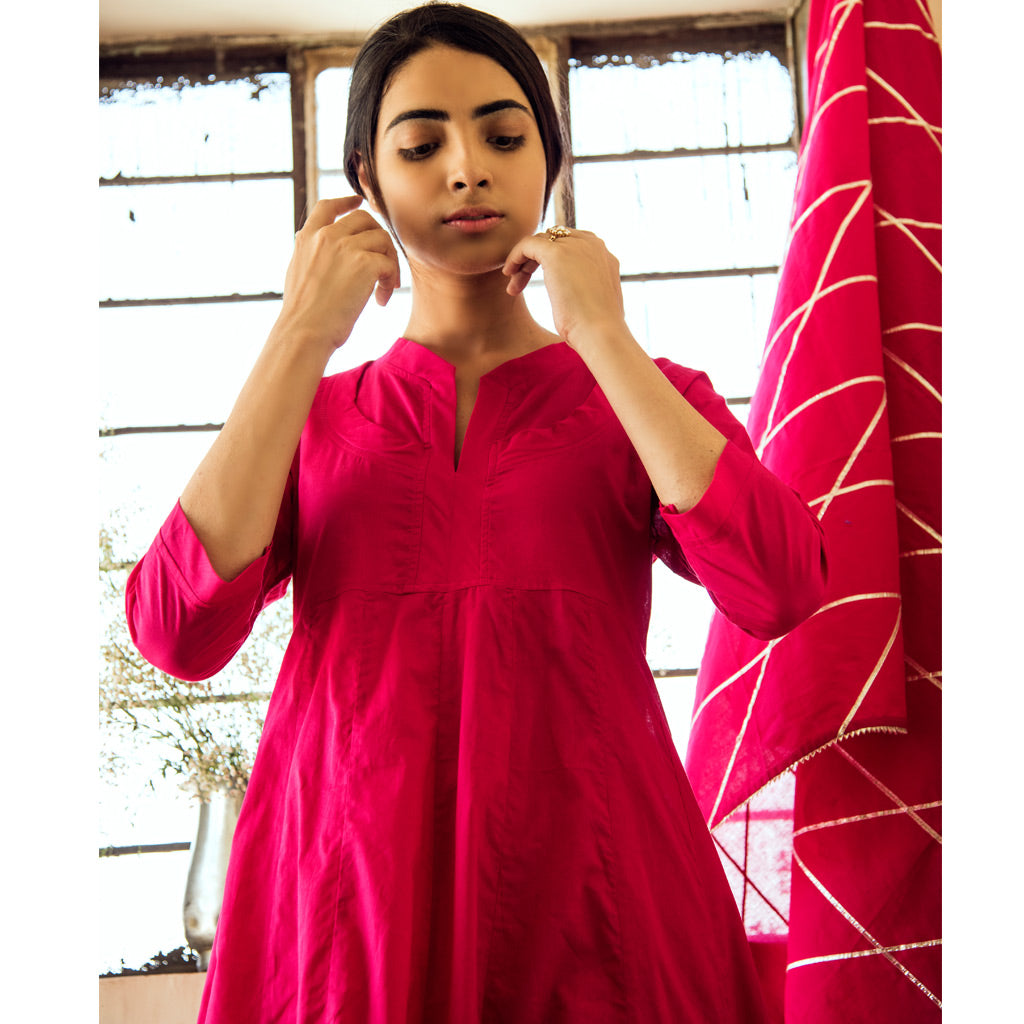 Our signature best selling outfit in a rani pink cotton mulmul. The Rajasthani kalidaar kurta is an inspiration from the kurti-kaanchali worn by Rajasthani women in their traditional outfits.