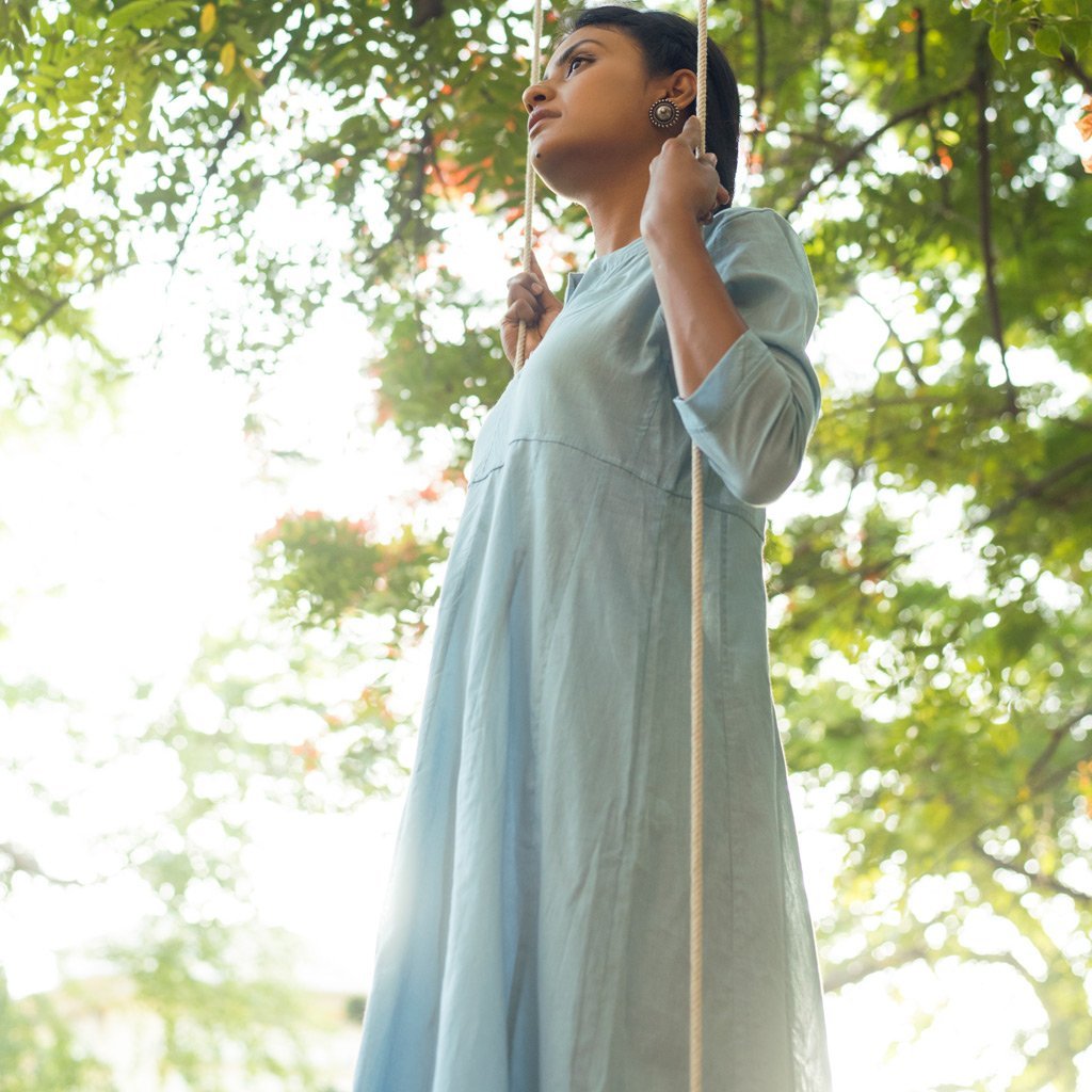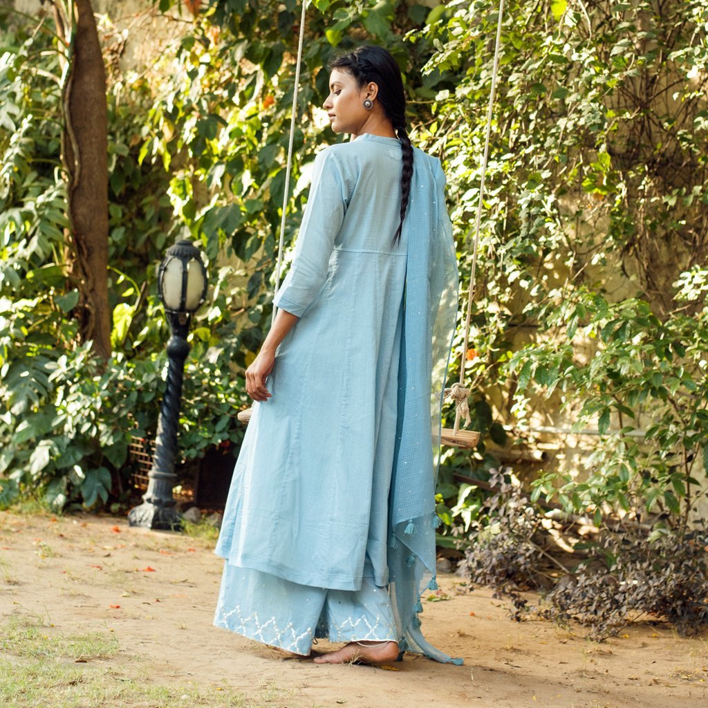Our signature best selling outfit in a sky blue cotton mulmul. The Rajasthani kalidaar kurta is an inspiration from the kurti-kaanchali worn by Rajasthani women in their traditional outfits.