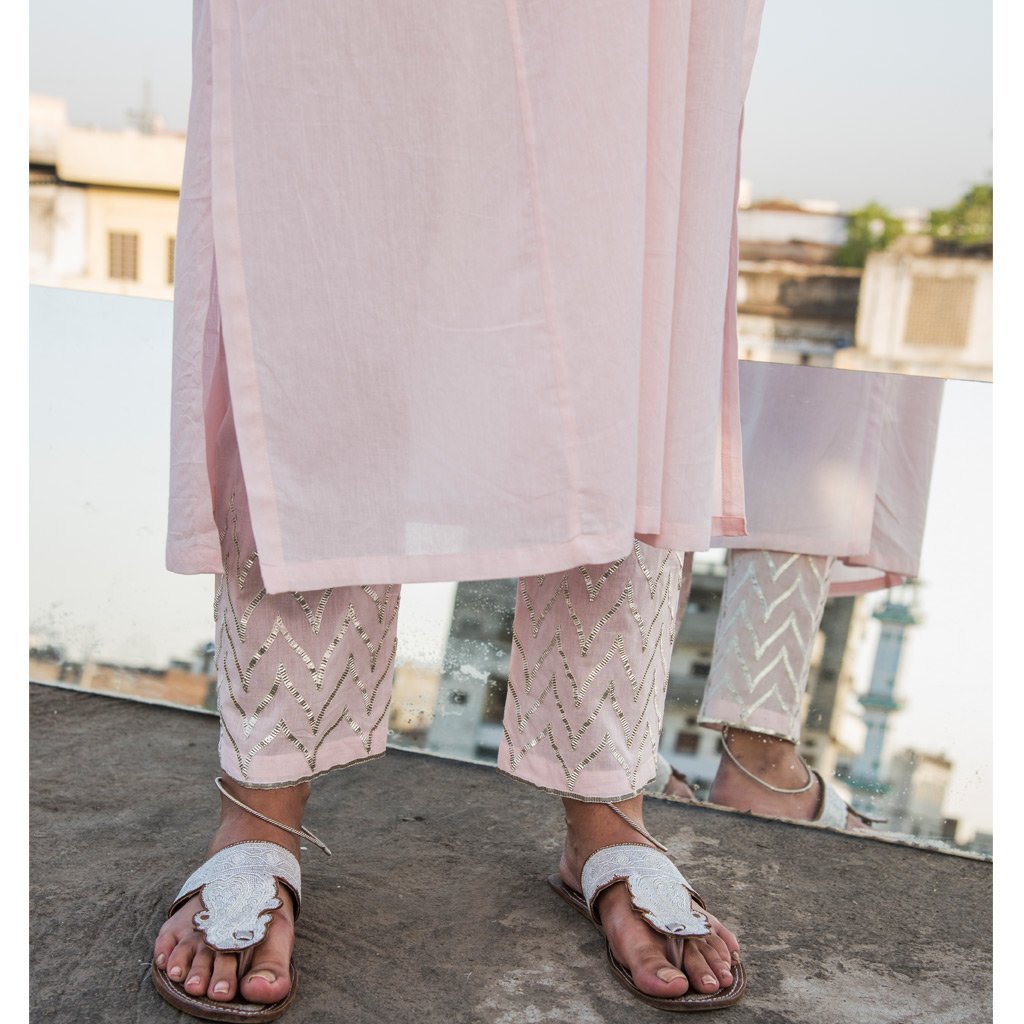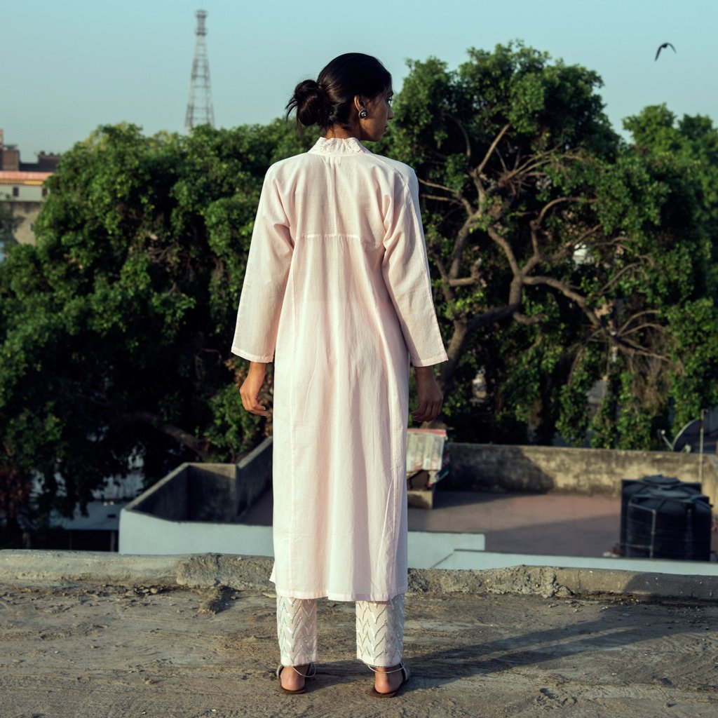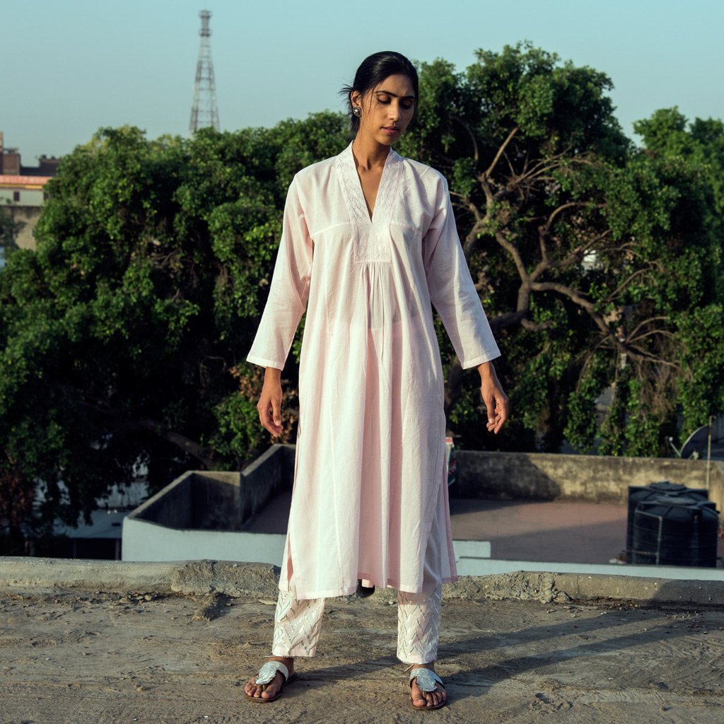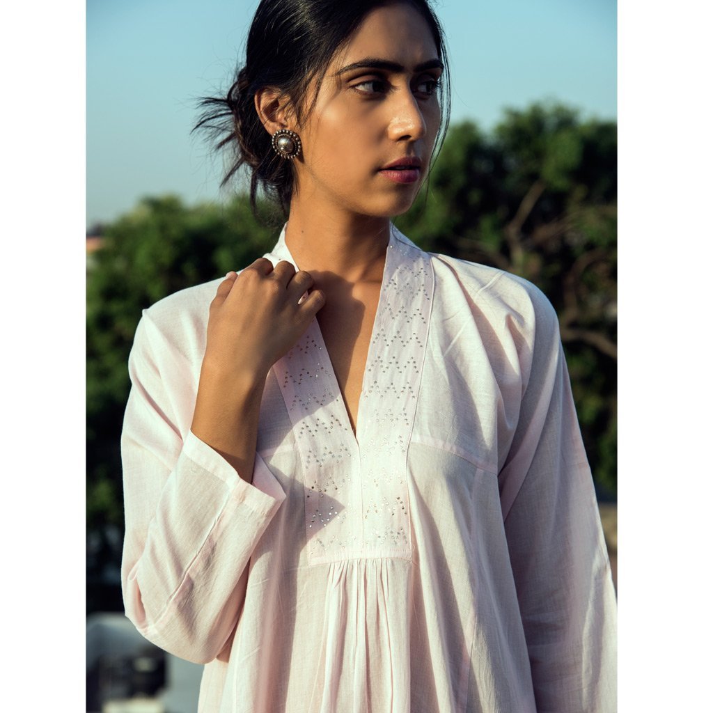 Kaftan style long kurta dress in powder pink cotton mul mul fabric, with a v-neckline embellished with lucknowi, silver coloured mukaish work in a mughal inspired chevron pattern.