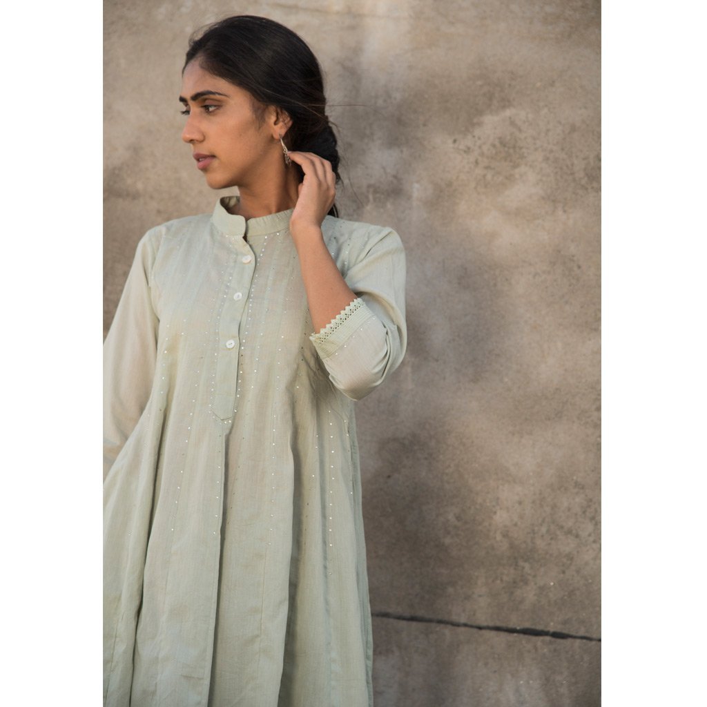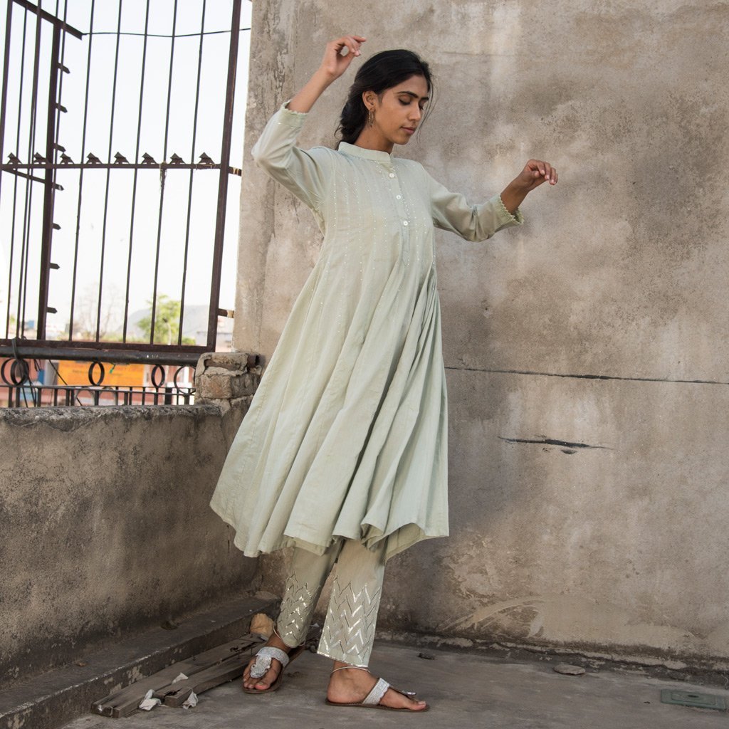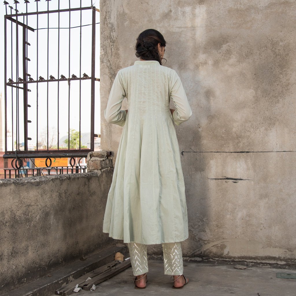 Our signature 36 kali kurta (chatees kali) with over 4mts of ghera in jade. Each kali is embellished with silver mukaish work (bits of silver metallic strips beaten to create a dot effect). This is a free flowing kurta, fitted only on the shoulders lending it a feminine feel.