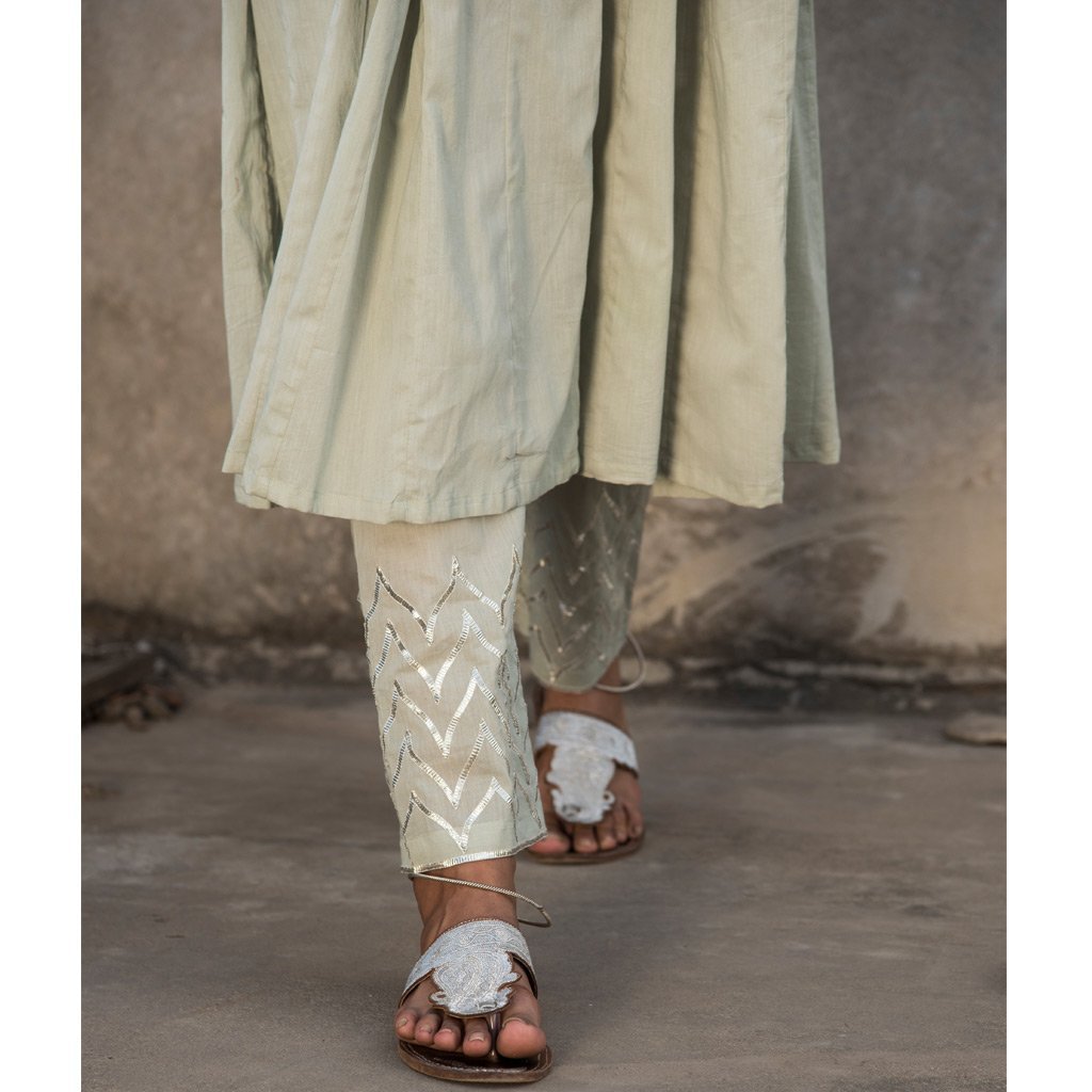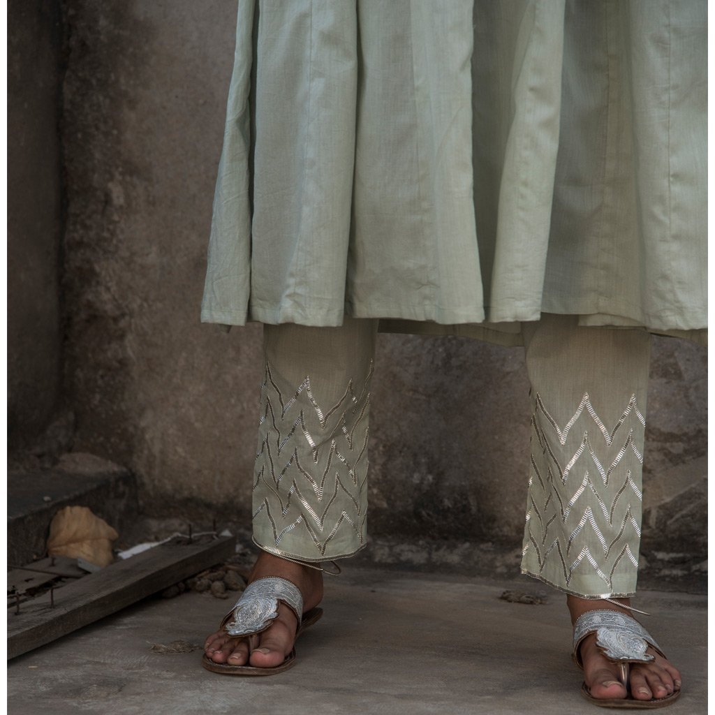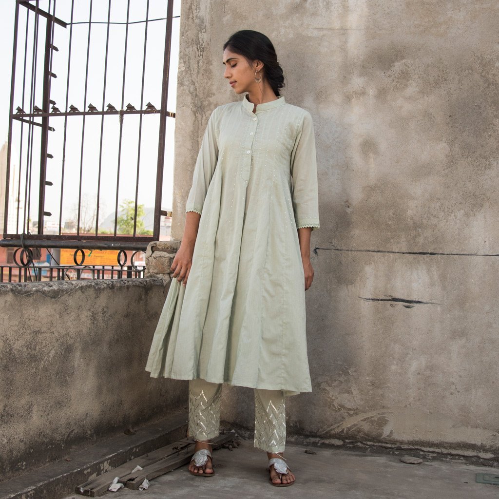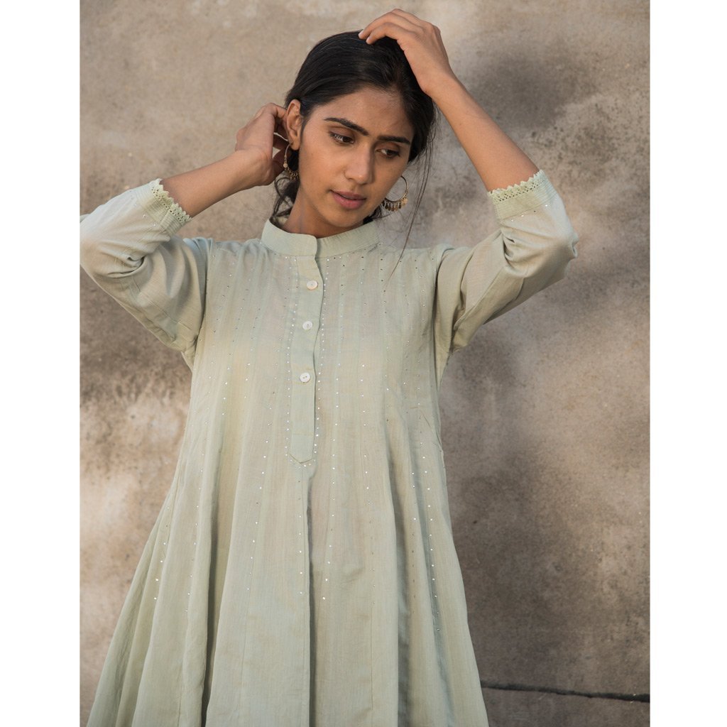 Our signature 36 kali kurta (chatees kali) with over 4mts of ghera in jade. Each kali is embellished with silver mukaish work (bits of silver metallic strips beaten to create a dot effect). This is a free flowing kurta, fitted only on the shoulders lending it a feminine feel.
